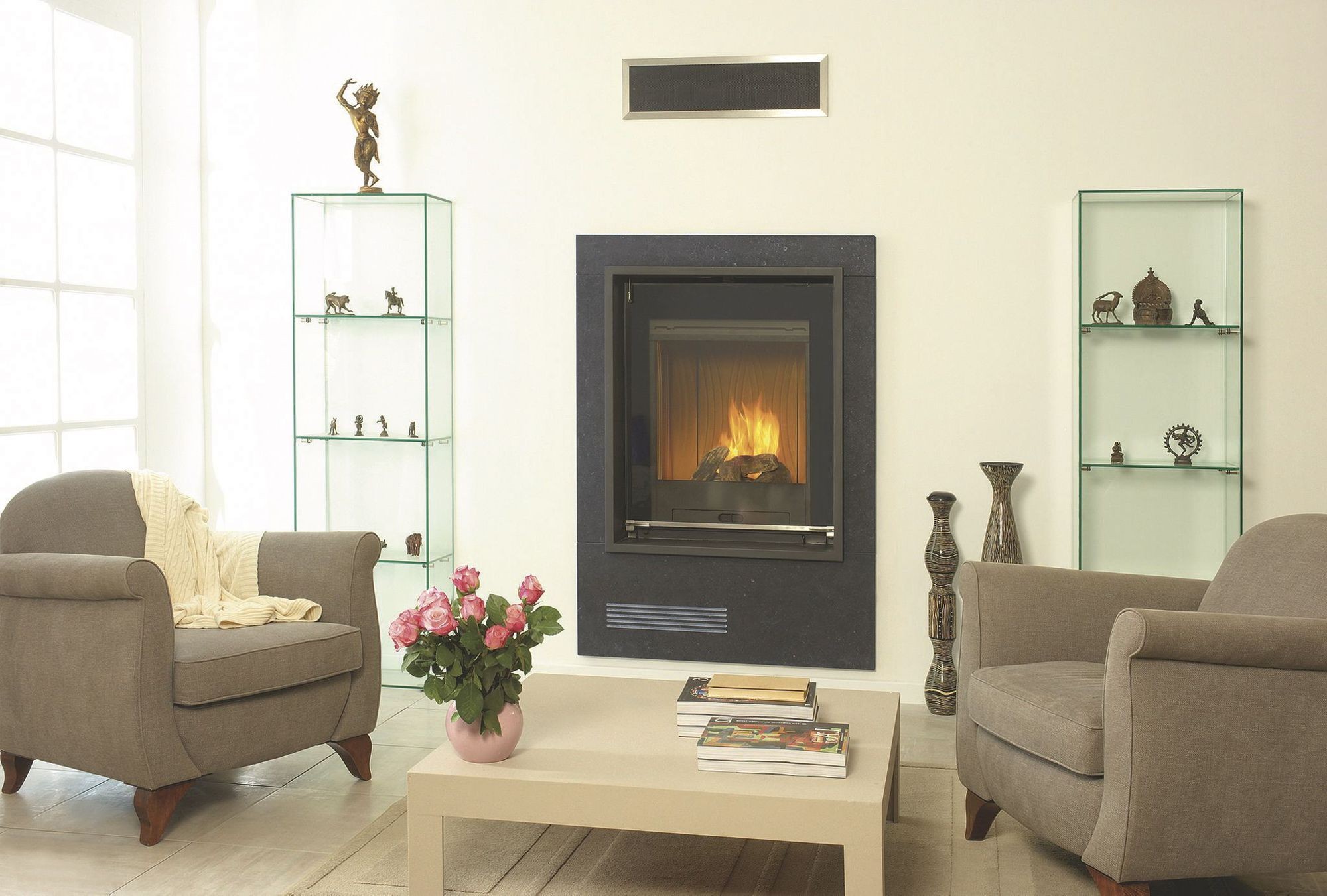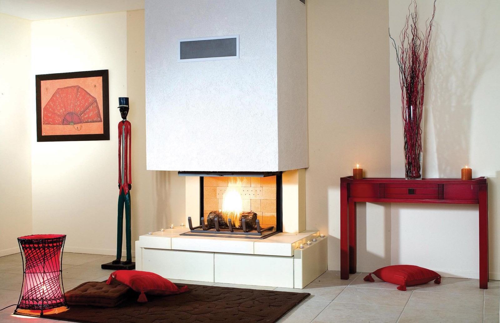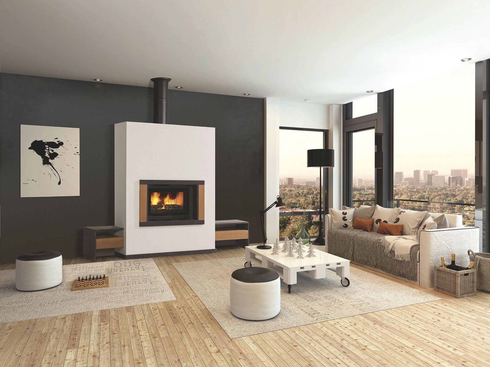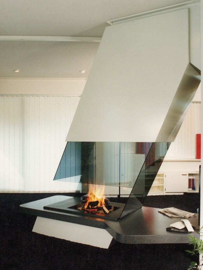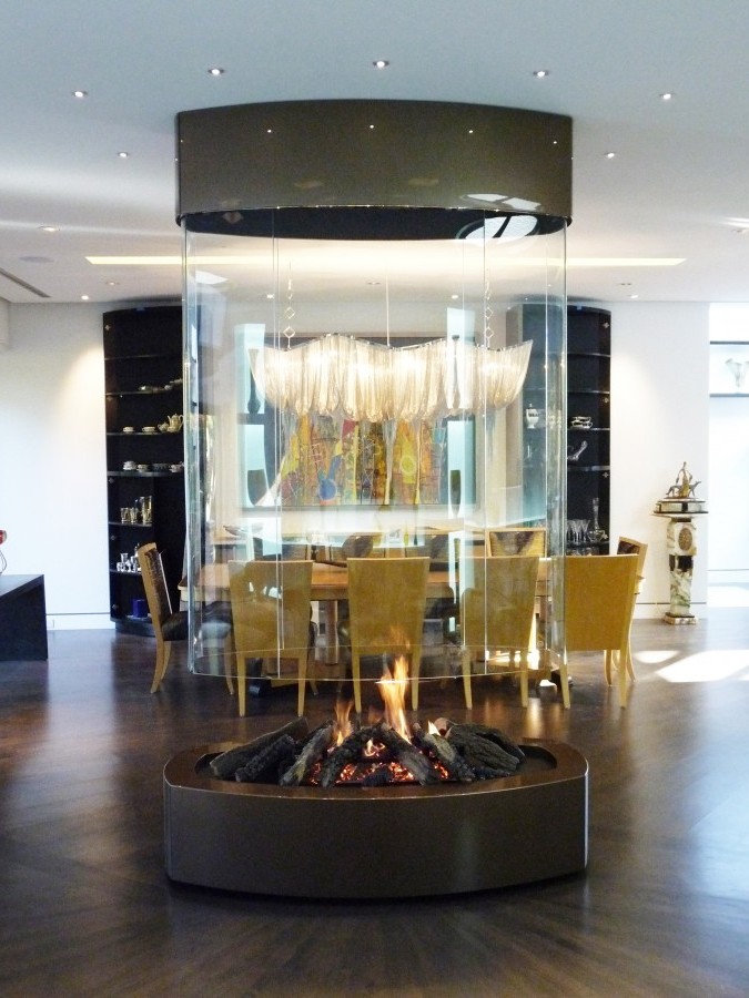 Эффектнее всего смотрится с панорамной открытой или закрытой топкой, позволяющей любоваться горящим огнем со всех сторон.