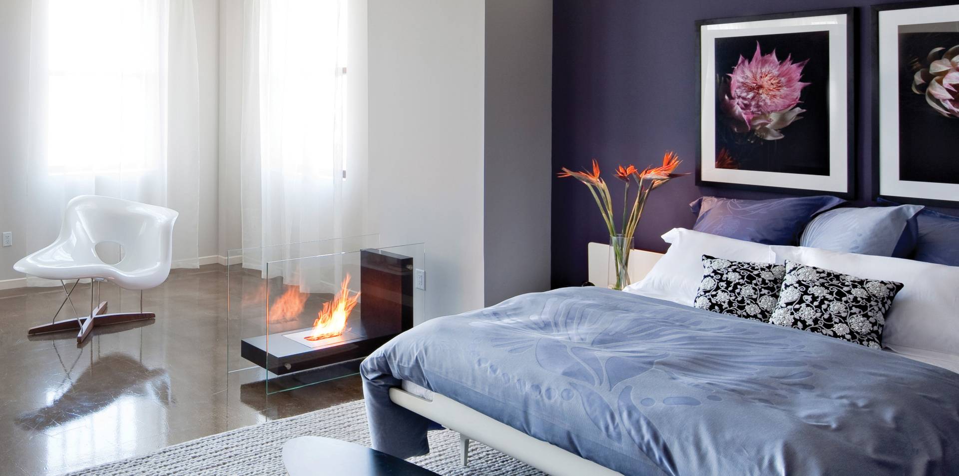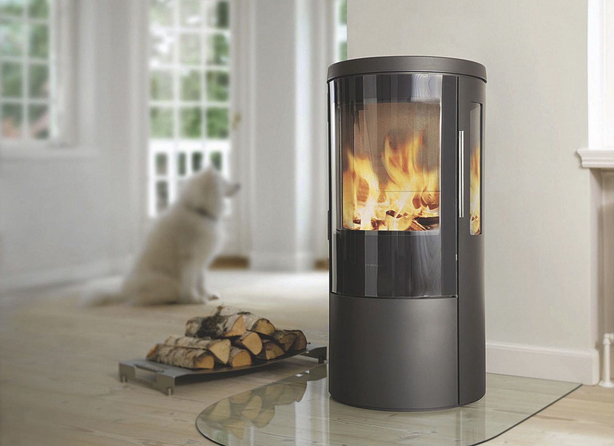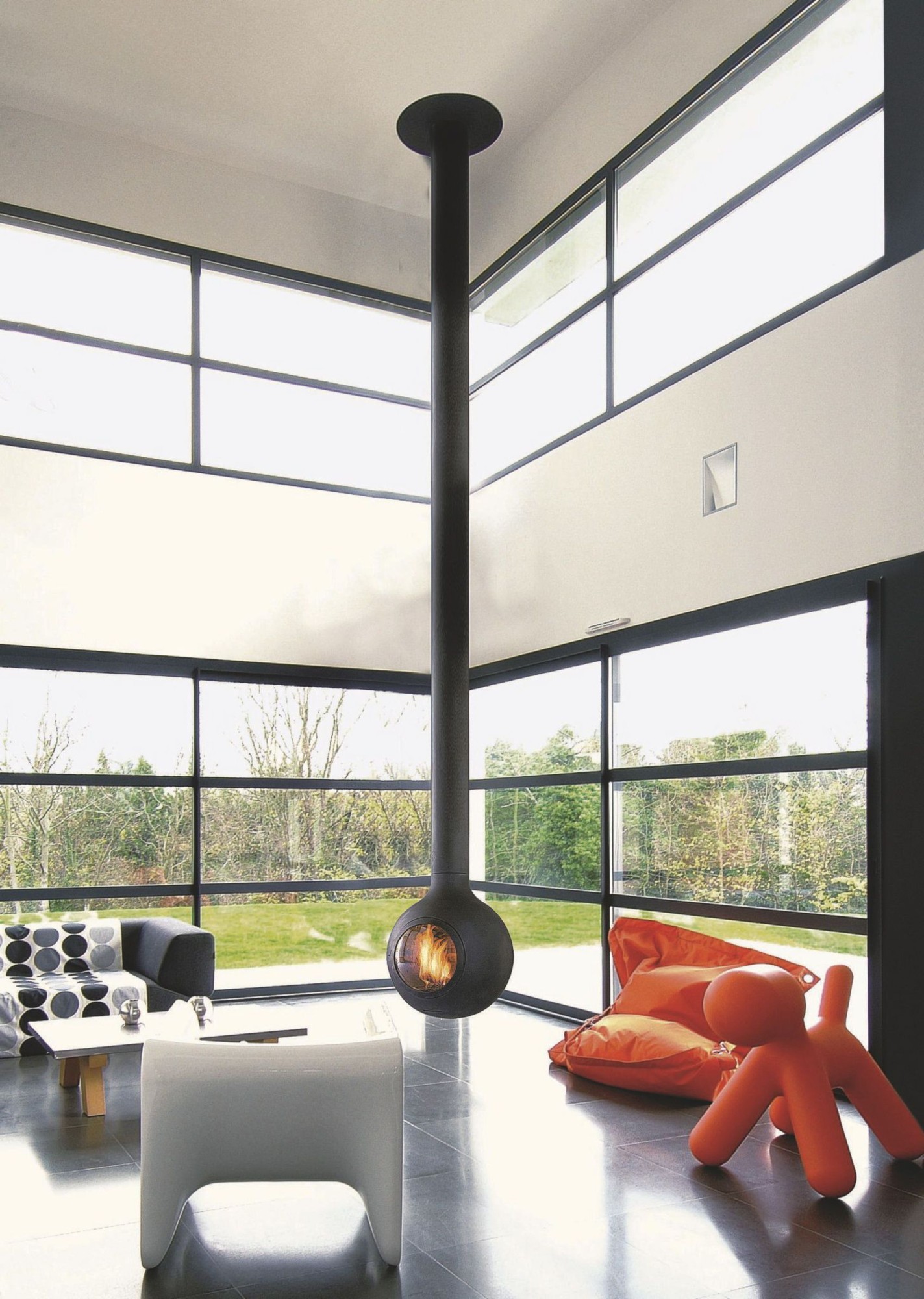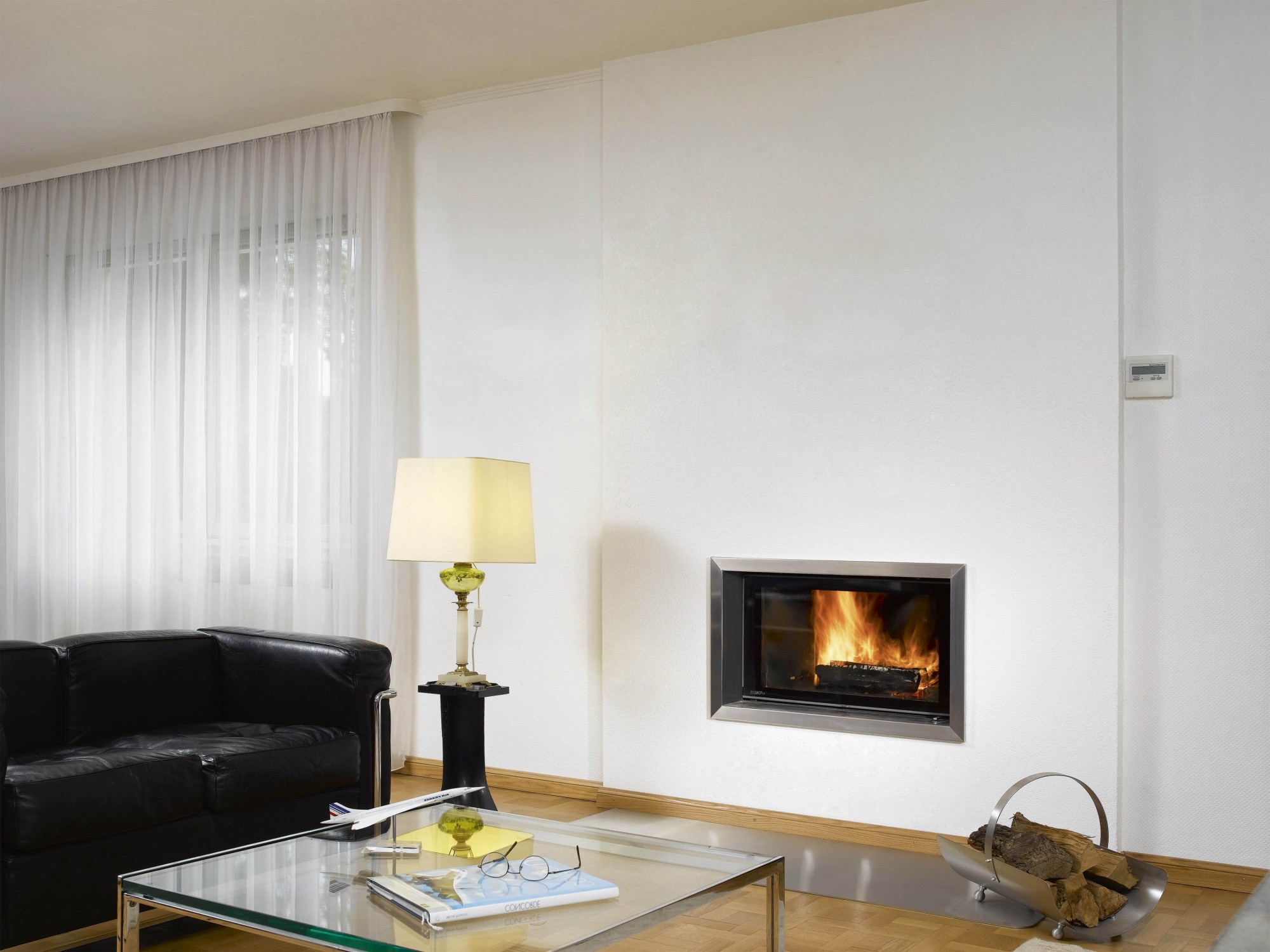 Эффектнее всего смотрится с панорамной открытой или закрытой топкой, позволяющей любоваться горящим огнем со всех сторон.