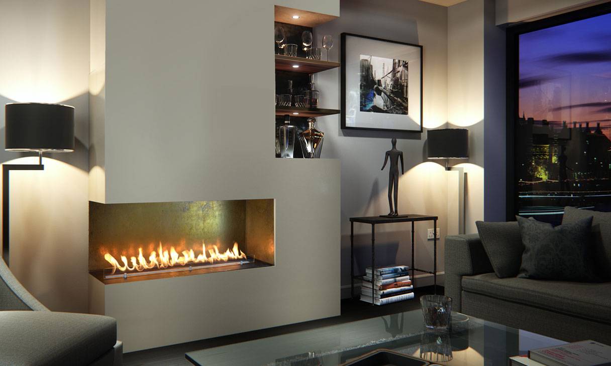 Угловые камины могут быть как встроенными, где топка и дымоход «утоплены» в боковые стены, так и пристенными.