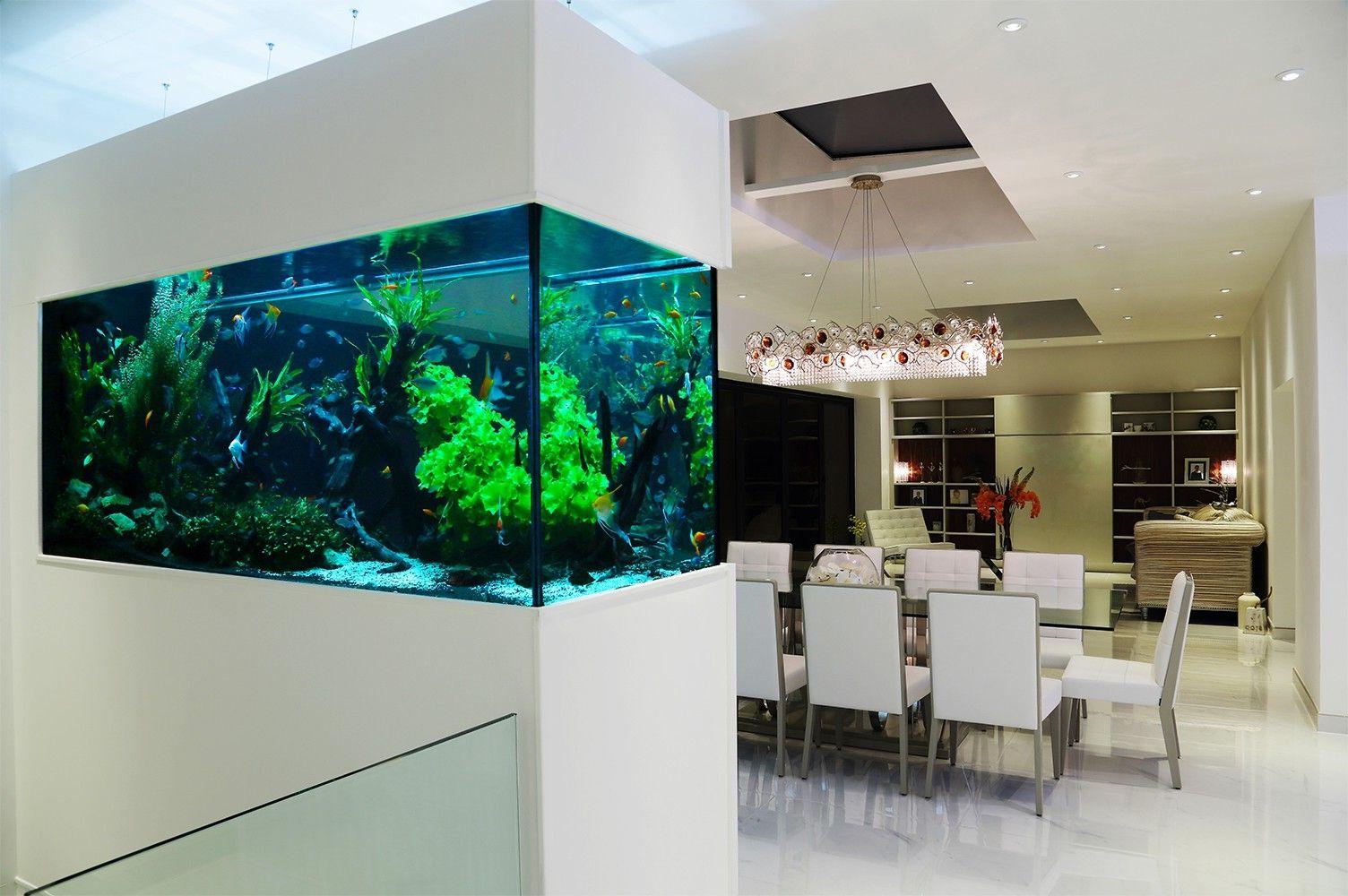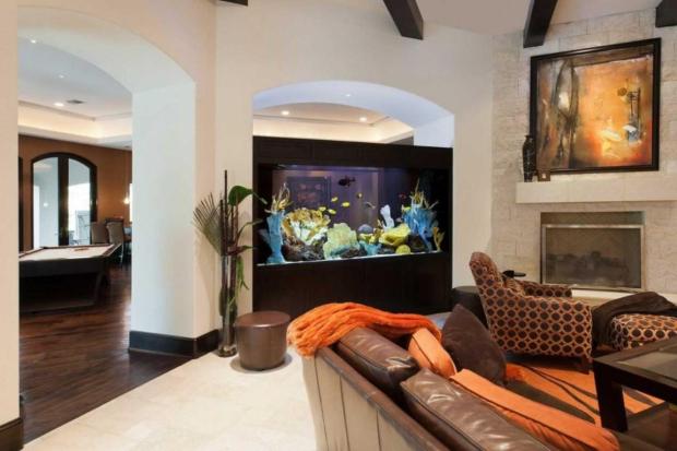 Аквариум в интерьере гостиной всегда привлекает внимание хозяев и гостей лучше любого декора. Но помимо эстетических качеств и успокаивающего эффекта от наблюдения за морской жизнью, аквариум увлажняет воздух, также аквариум может служить как эффектная перегородка в интерьере открытой планировки.