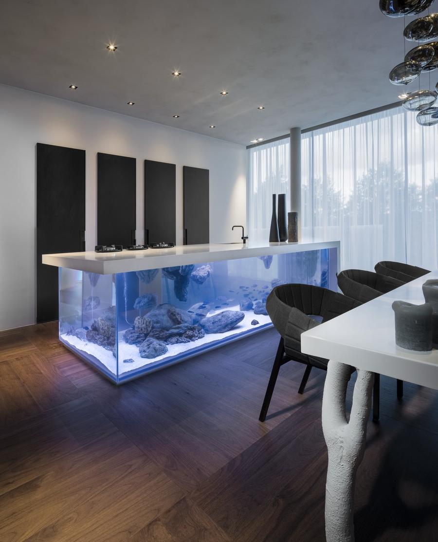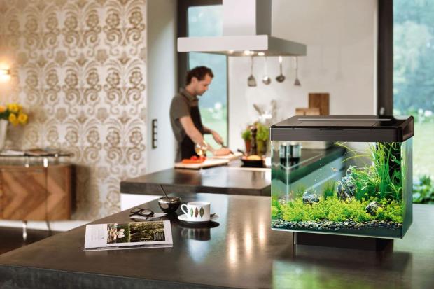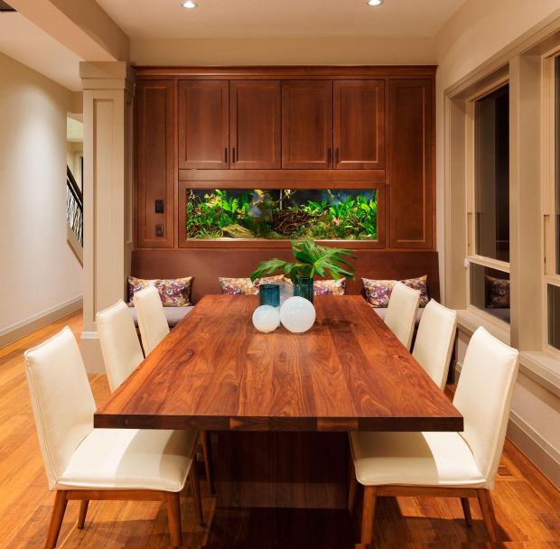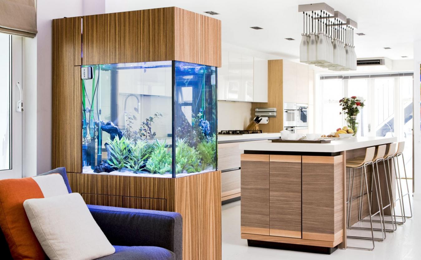 Аквариум в интерьере кухни устанавливают в нишах, как картину на стене или дверце холодильника, встраивают в барную стойку или шкаф. Чаще всего, кухня имеет маленькую полезную площадь, поэтому оправданный прием — вписать в стены или мебель. Из-за необходимости проветривать кухню, рекомендуем выбирать небольшой аквариум, который быстро нагреется после проветривания.