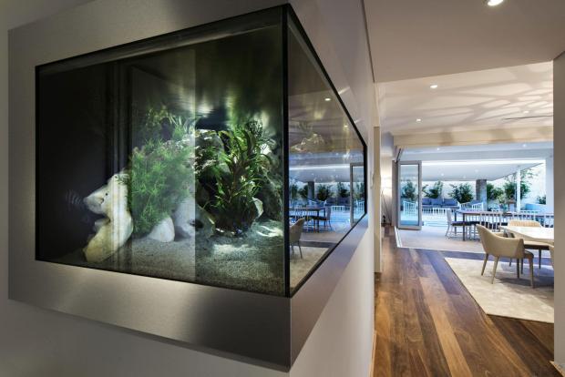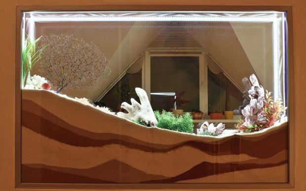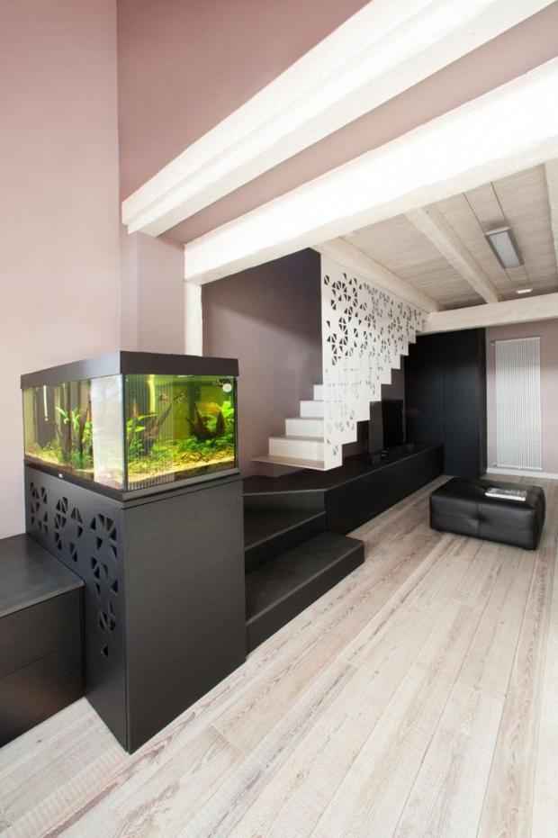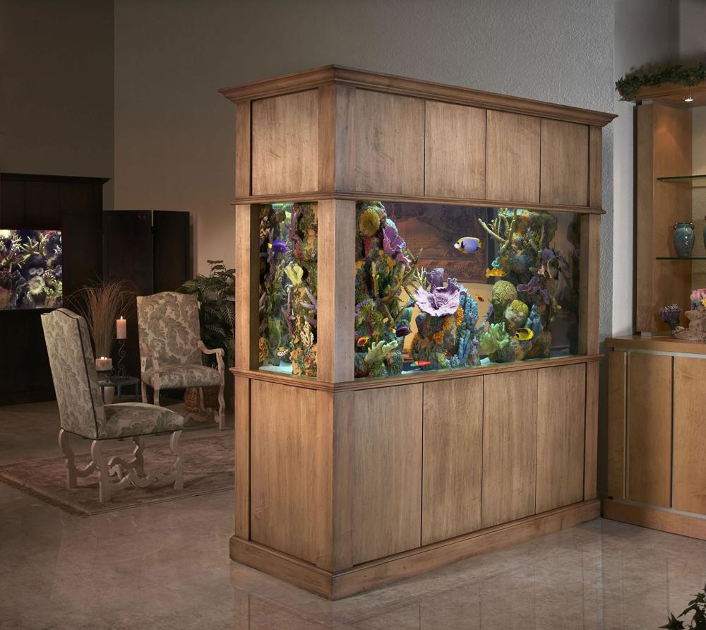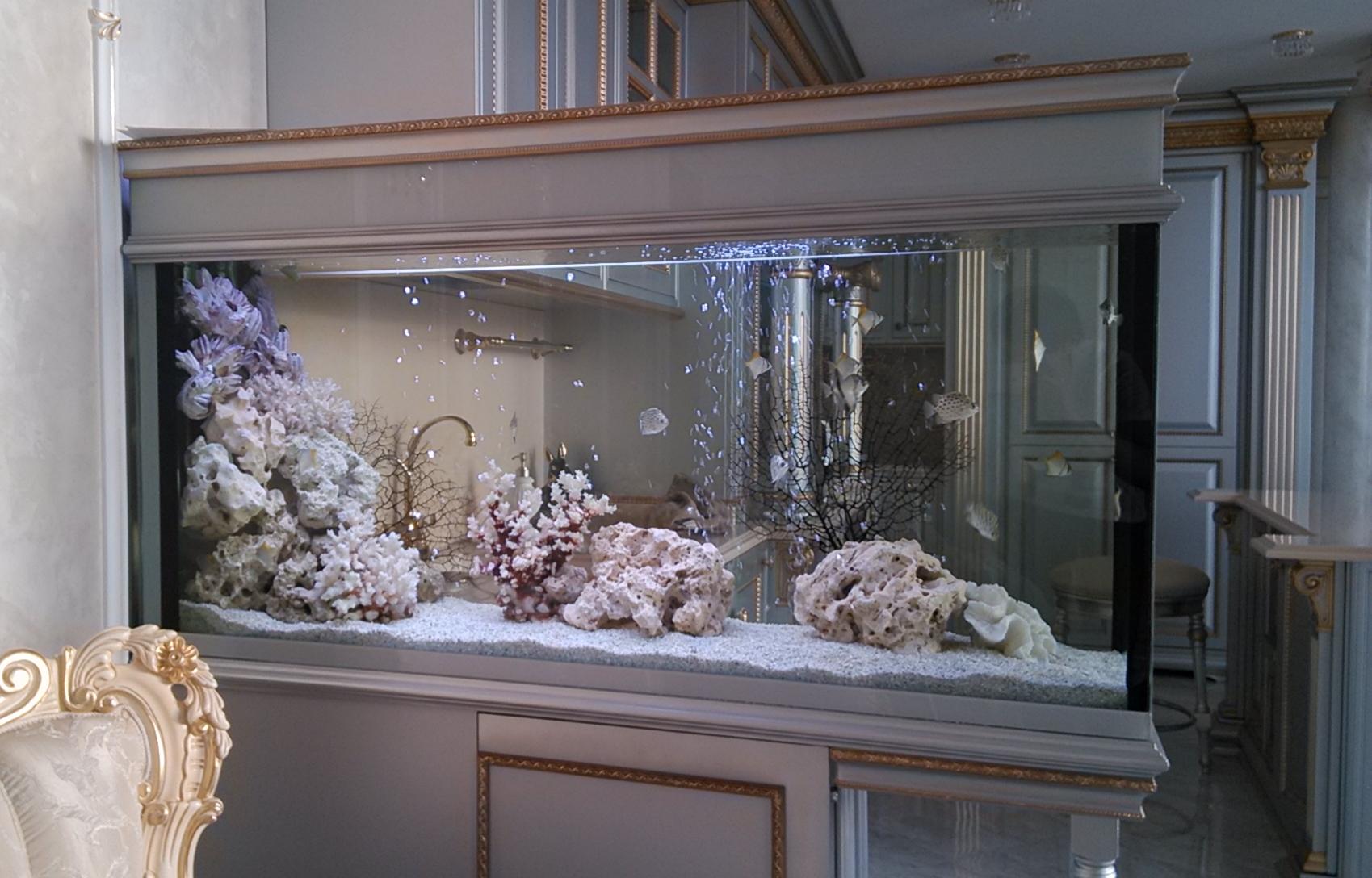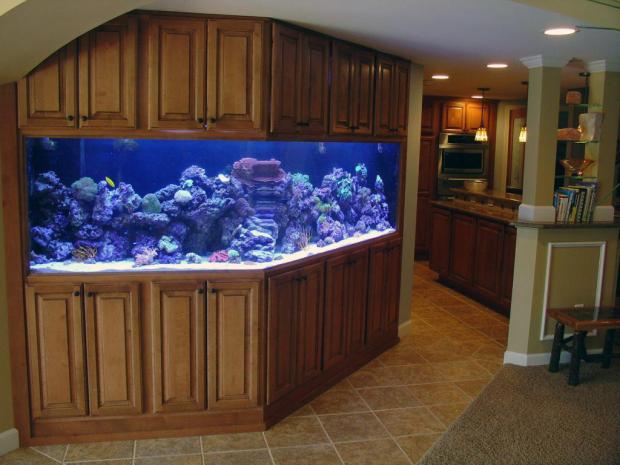 - встроенные в стену аквариумы – один из любимых дизайнерских приемов; аквариум сооружают в нишах и специально построенных конструкциях, часто на границе двух комнат или в качестве перегородки.