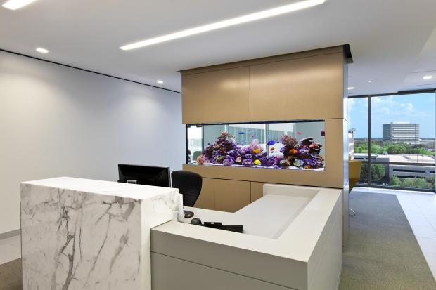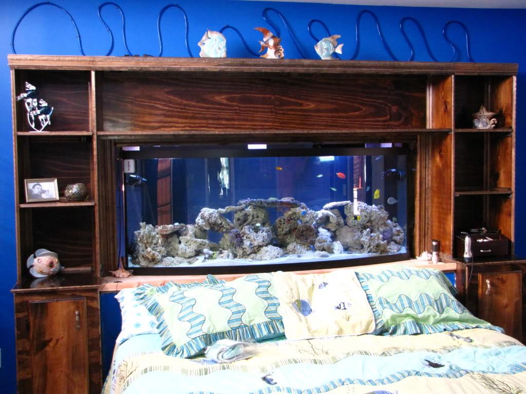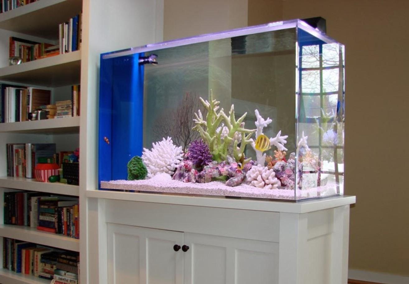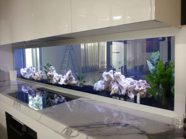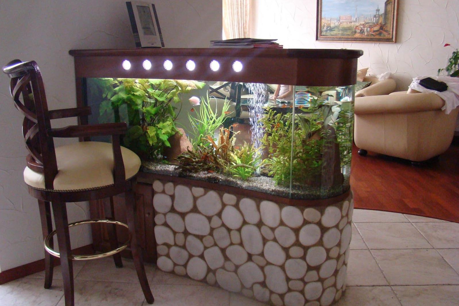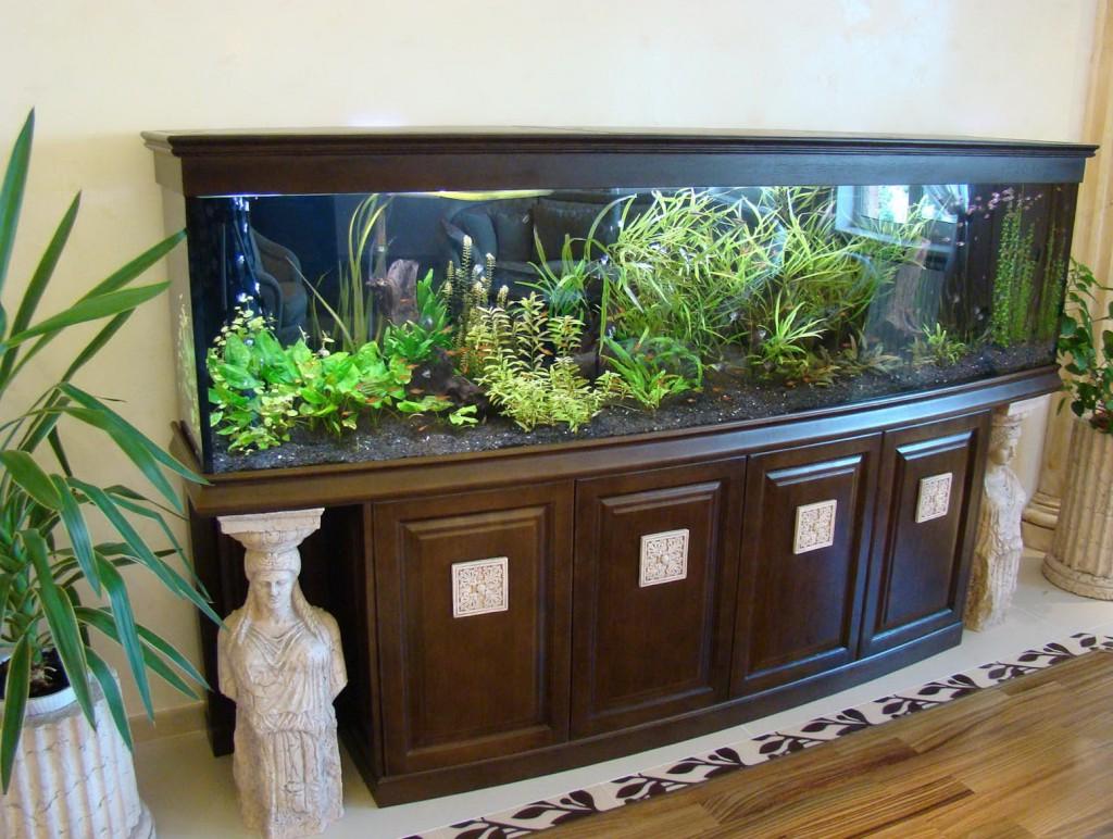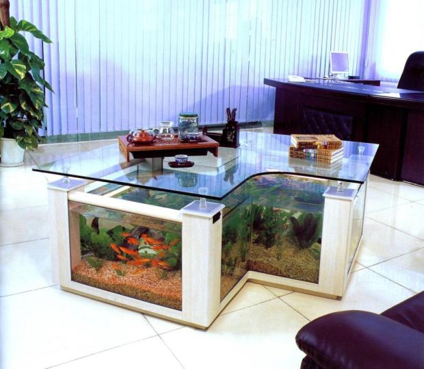 - встроенный в мебель аквариум все чаще встречается в магазинах: журнальные столики, шкафы-стенки, барные стойки становятся интереснее за счет подсветки и насыщенной жизни аквариумных жителей;