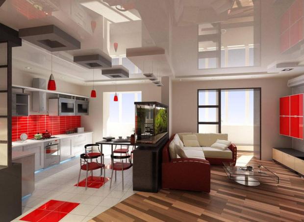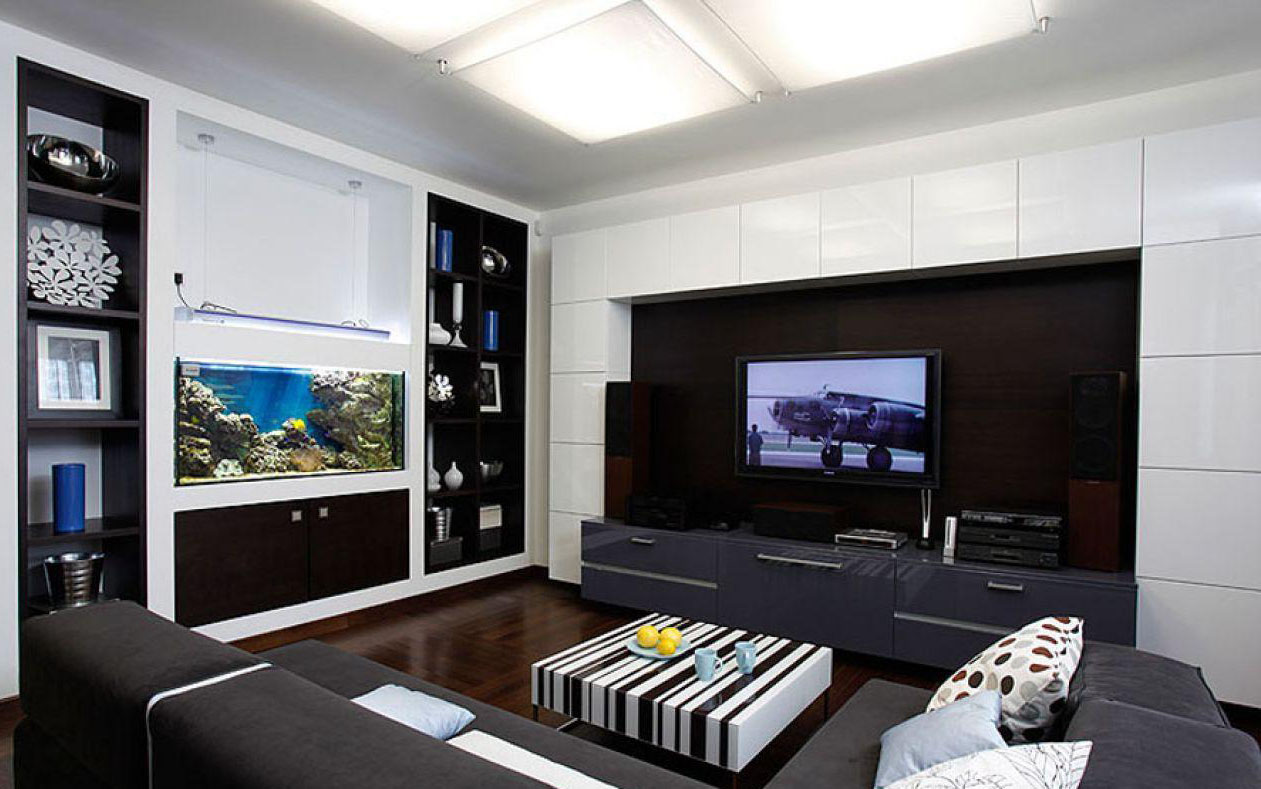 Аквариум в интерьере гостиной размещается в виде отдельно стоящей конструкции, как ограждение между зонами кухни-гостиной, в качестве украшения на стену (аквариум-картина). Чтобы вода не цвела под палящим солнцем, рекомендуется располагать аквариум подальше от окон, допустимо размещение в темных углах комнаты.
