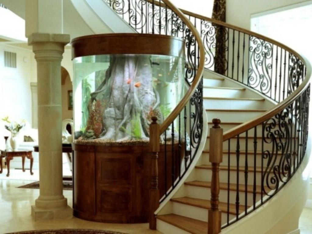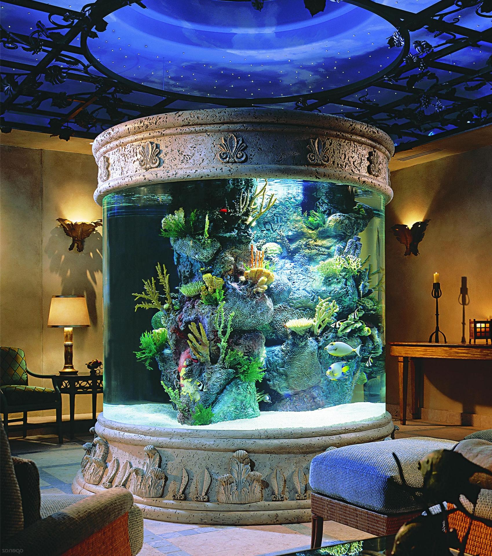 - круглый аквариум в интерьере может быть малых размеров, как декор, или располагаться на полу на массивной круглой тумбе в высоту до потолка;