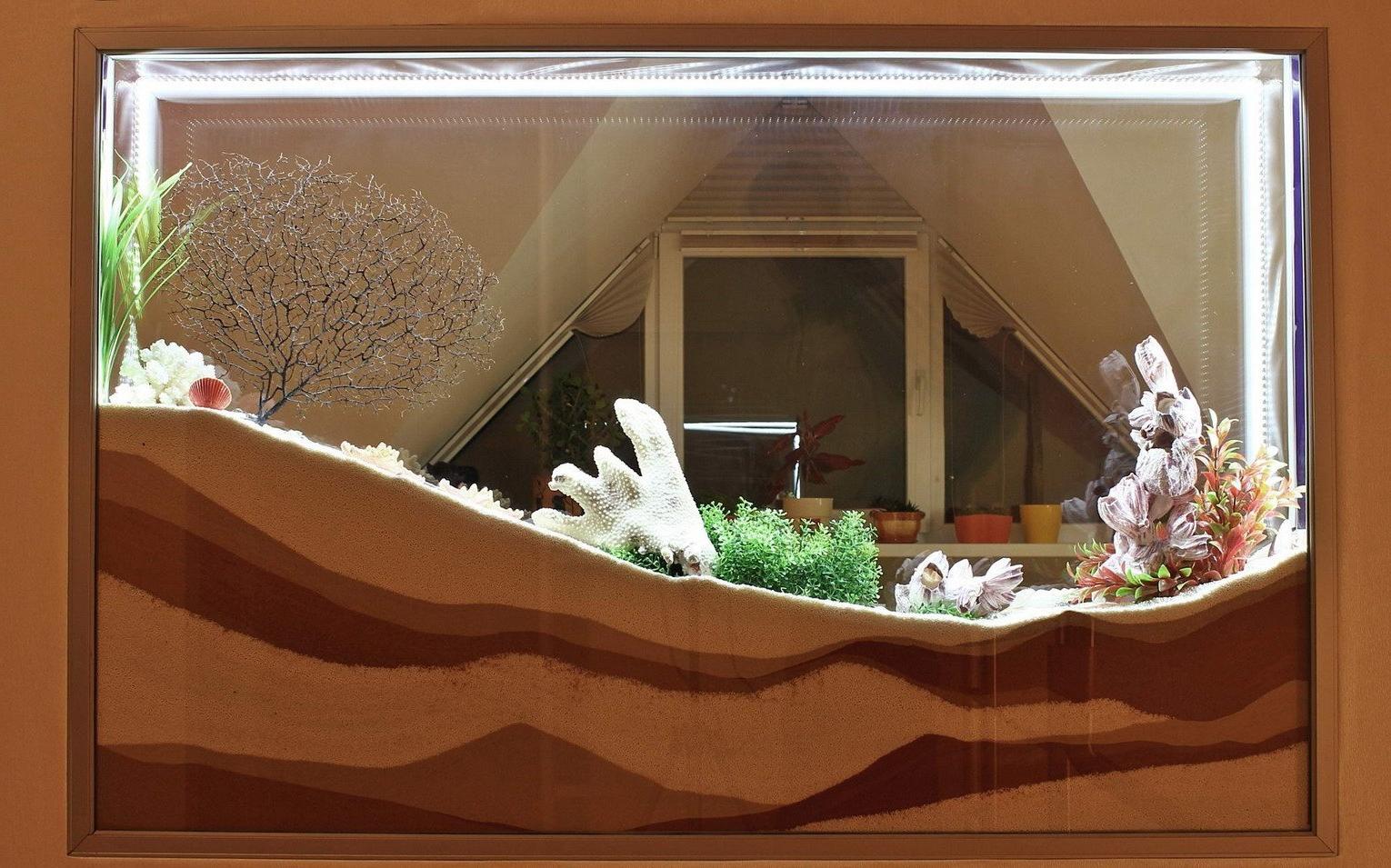Декоративная композиция в стеклянном сосуде с песком, галькой, кораллами, морскими звездами, ракушками, искусственными растениями. Сухие аквариумы неприхотливы в обслуживании и имеют меньший вес.