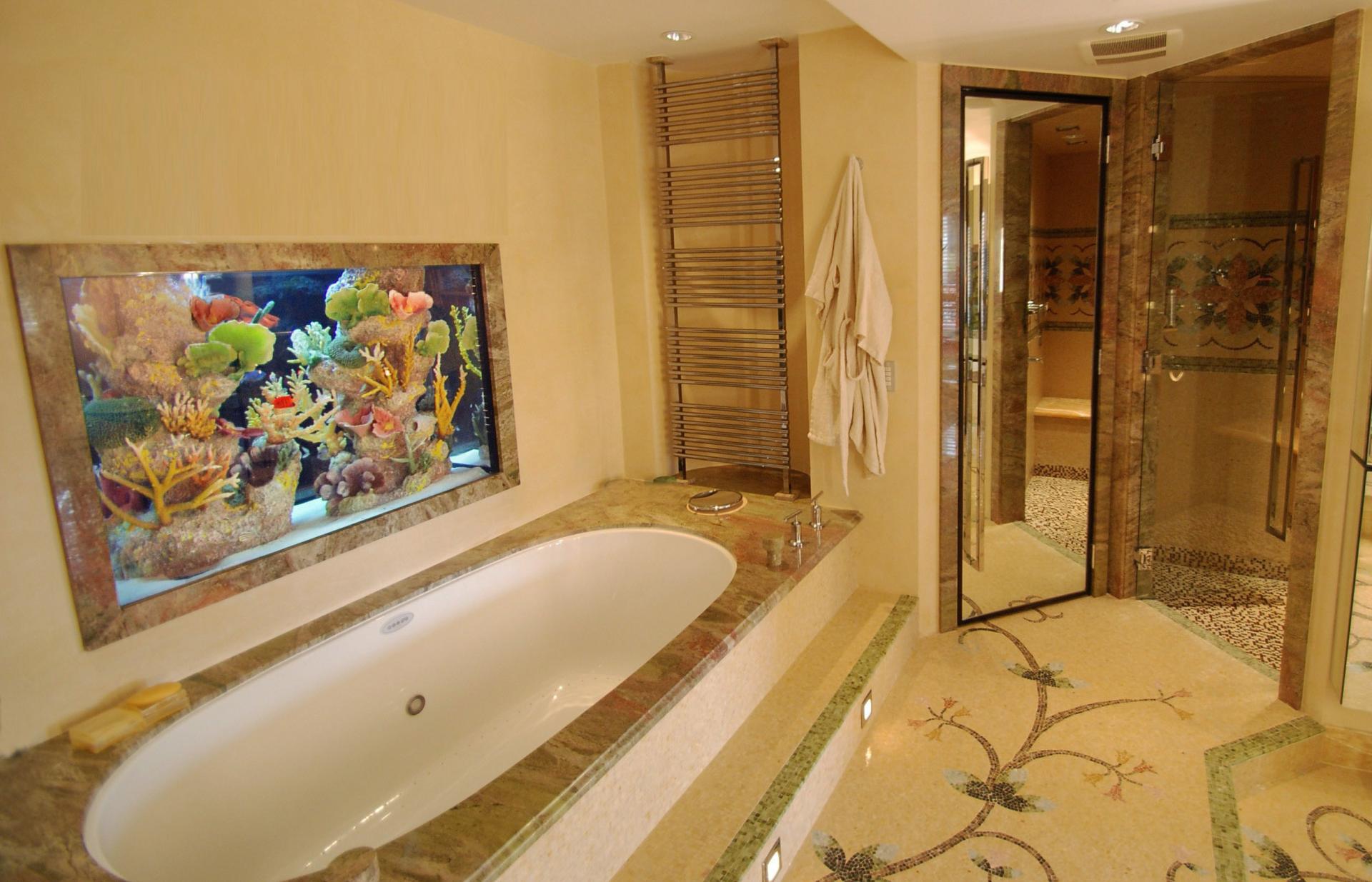 - Вписывать аквариум в интерьер необходимо до ремонта, учитывая его размеры (с оборудованием), необходимые условия и подводку воды-канализации (не дальше 10-15 м), если аквариум не является изначально герметичной системой.