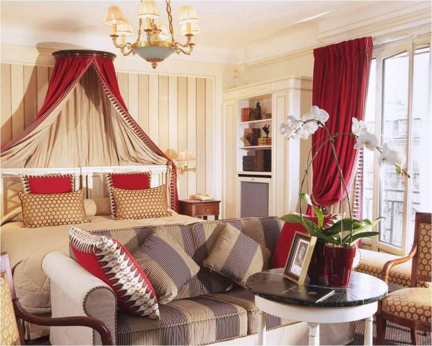 Насыщенный красный цвет задействуется в качестве мягкой обивки, дорожек, штор. - Синий.
