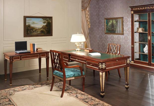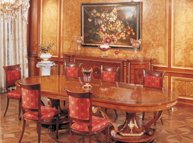 Мебель в стиле ампир для каждого помещения подбирается одной породы. Довольно популярны консоли, банкеты с мягкой обивкой бархатом, кресла с массивными мягкими спинками, невысокие журнальные столики с массивными ножками, кровати с балдахинами, зеркала-псише, шкафы-витрины с полочками из стекла, большой обеденный стол со стульями с высокими спинками.