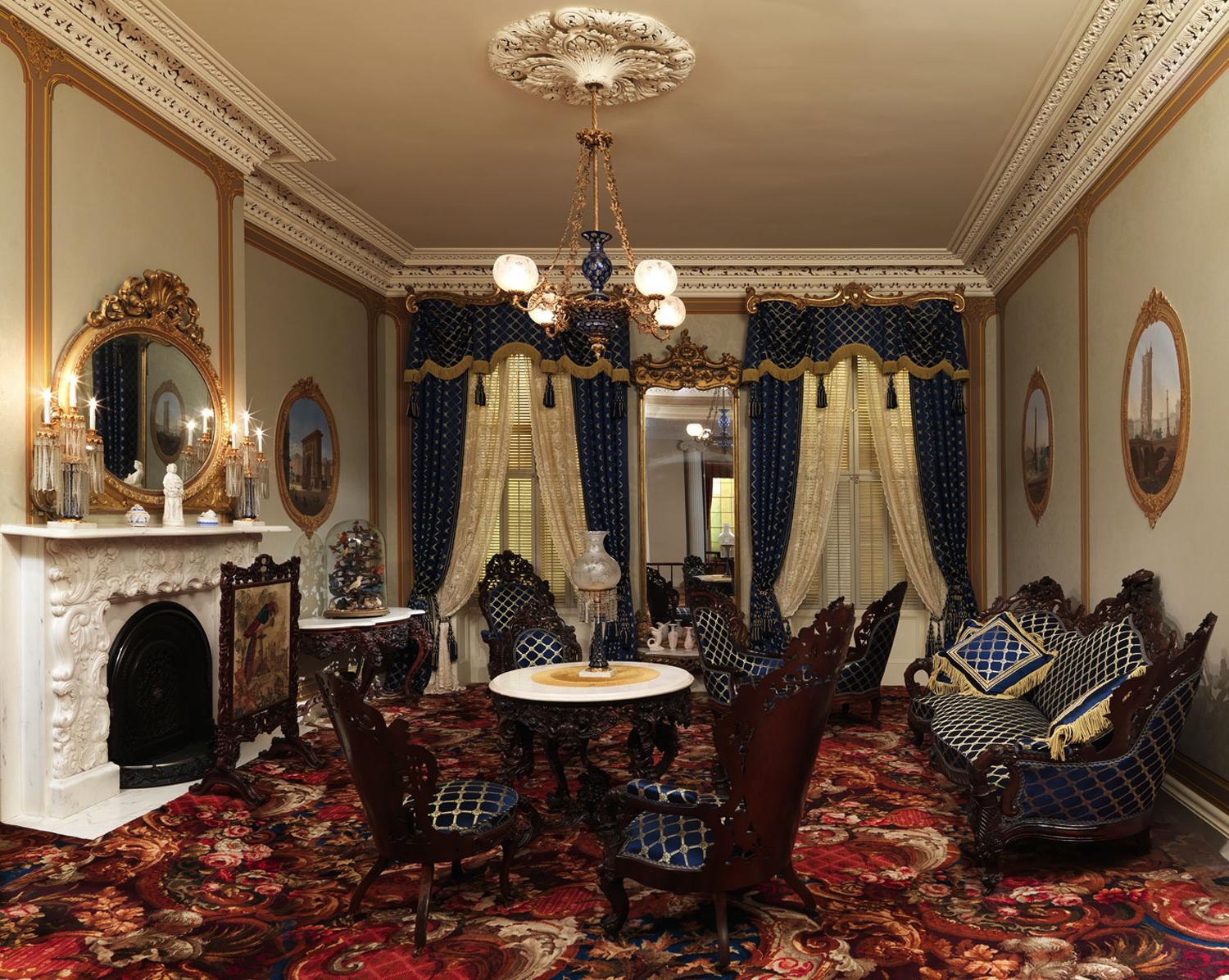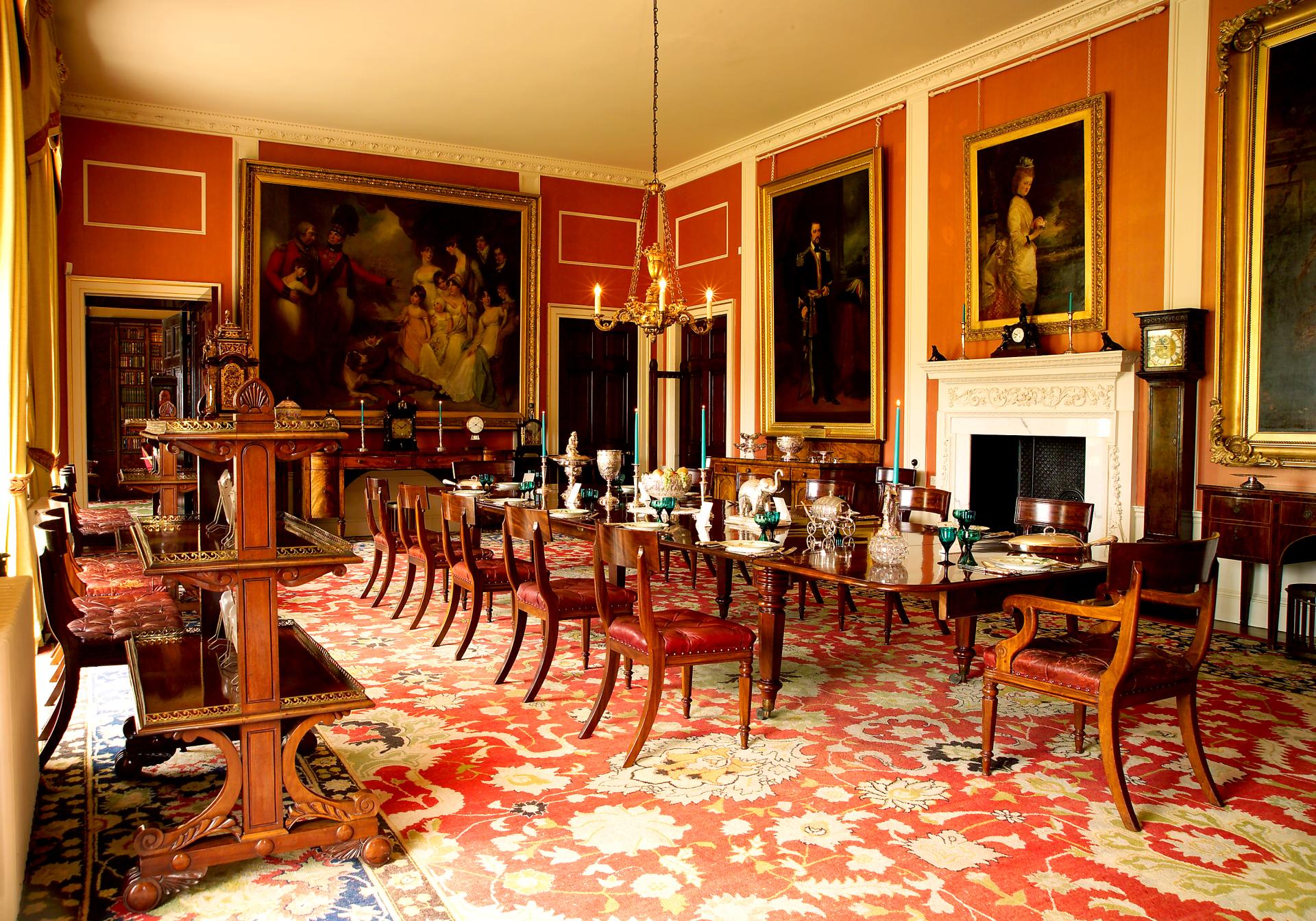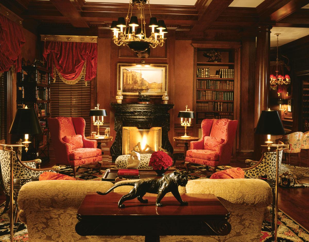В качестве декора на стенах используют оружие (мечи, щиты, шпаги), а также картины маслом в массивных рамах – семейные портреты, изображения великих полководцев, императоров, реже – пейзажи.