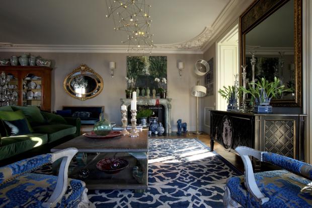 – ковер с абстрактным рисунком, лакированный шкаф плюс традиционные хрустальные светильники.
