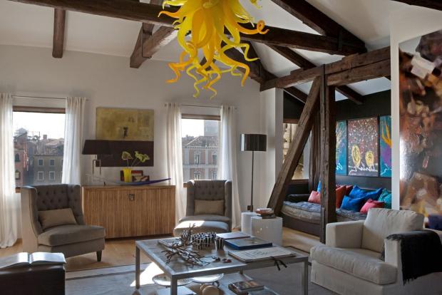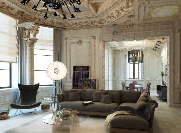 Оформление потолка зависит от смешиваемых тематик. Когда одна из них классика или барокко, то допускаются лепные и позолоченные украшения. Когда комбинируется лофт – уместны деревянные балки на потолке или подвесные металлические конструкции.