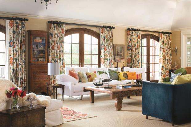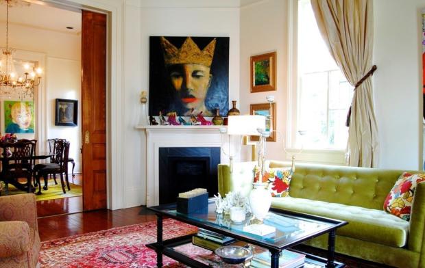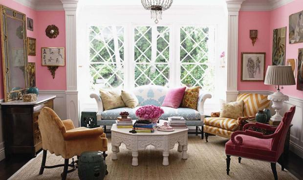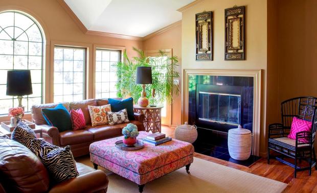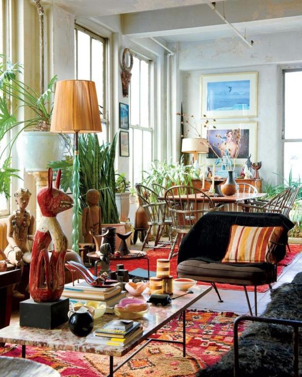 Такая обстановка всегда наполнена множеством текстильных аксессуаров (подушками, шторами, салфетками), стены увешаны картинами, фотографиями, зеркалами. Необычные текстуры и орнаменты главенствуют.