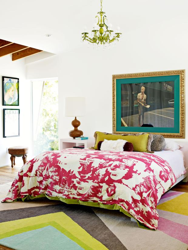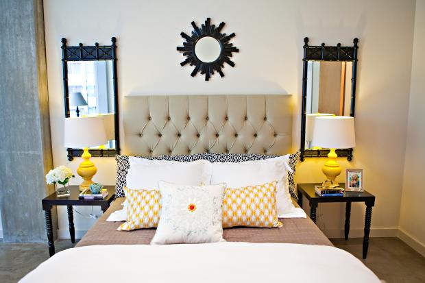 – металлическая кровать как элемент хай-тека или минимализма плюс уютные теплые вещи из этники (подушки, покрывало, накидки) или броские солнечные акценты поп-арта;