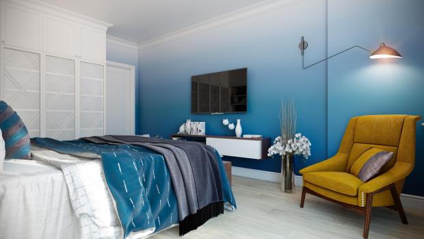 Одну стену в помещении допускается оформить контрастно. А текстиль в оттенках одного цвета аккуратно соберет интерьерную композицию воедино.