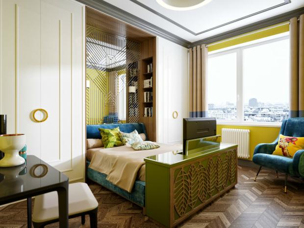 Главная задача – выдержать концепцию смешанной стилистики, одновременно не перегрузить обстановку деталями, иначе расслабиться перед сном здесь не получиться.