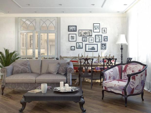 Приветствуются винтажные вещи: отреставрированные стулья, туалетные столики, витрины. Выгодное контрастное дополнение им составят диваны и кресла современных силуэтов и расцветок. Мебель из разных материалов (дерева, стекла, металла) и исторических эпох будет смотреться гармонично, если при ее отборе руководствоваться единством цвета, орнаментов или декоративных элементов.