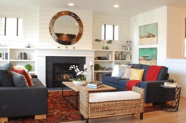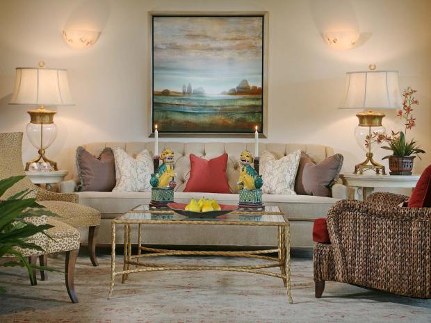 – выбрать одну форму и повсеместно внедрить ее (пример: круглые диванные подушки, обрамления картин, зеркал, круглая люстра, круглый журнальный столик);
