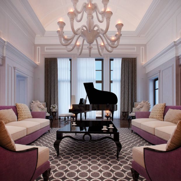 В идеале комната должна иметь правильную геометрическую форму, что позволит реализовать главенствующий принцип симметрии. Но и при сложной планировке стиль успешно реализуется.