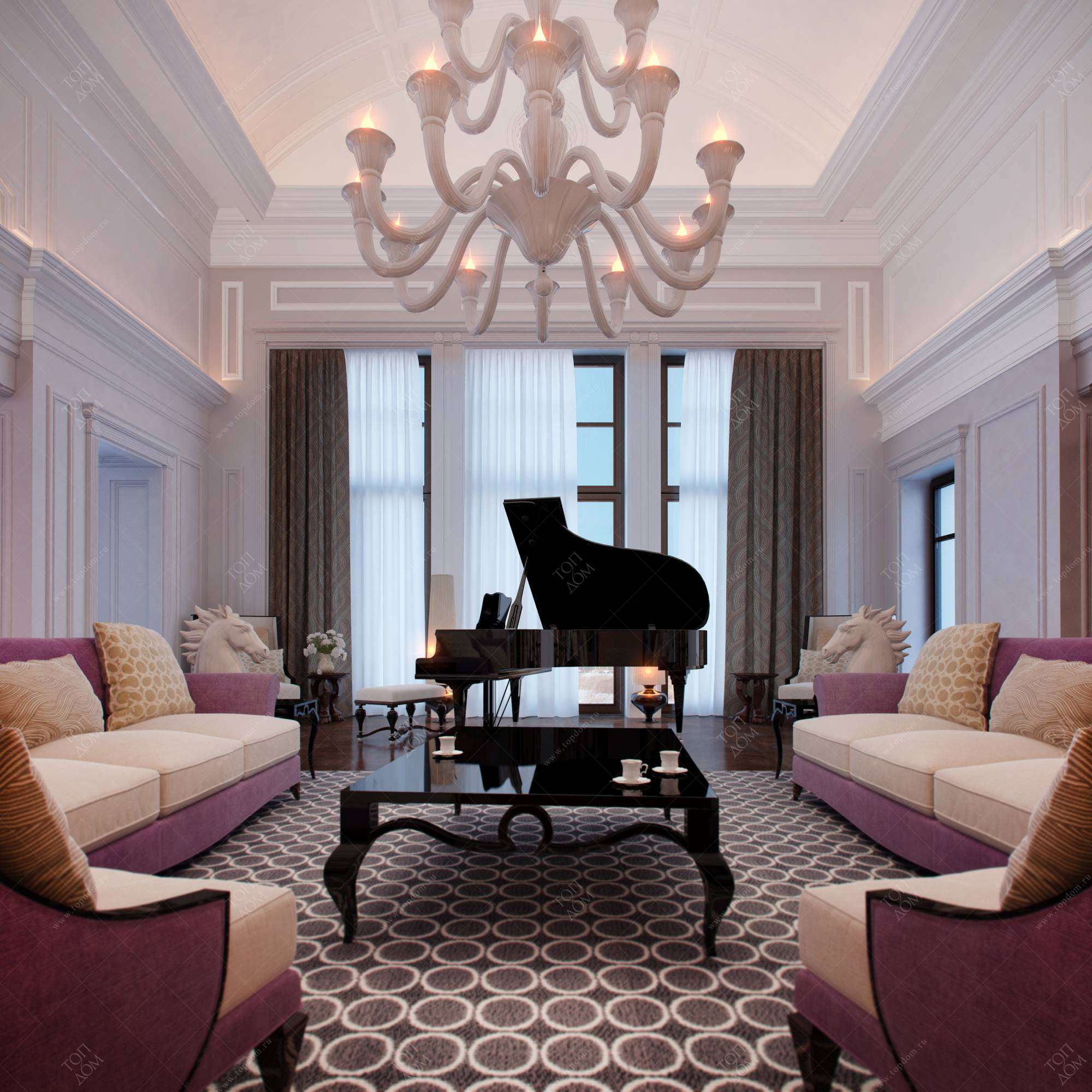 Главный принцип в планировке конкретного помещения – симметрия. Реализуется он за счет парных элементов обстановки: книжных шкафов, светильников, диванов, кофейных столиков.