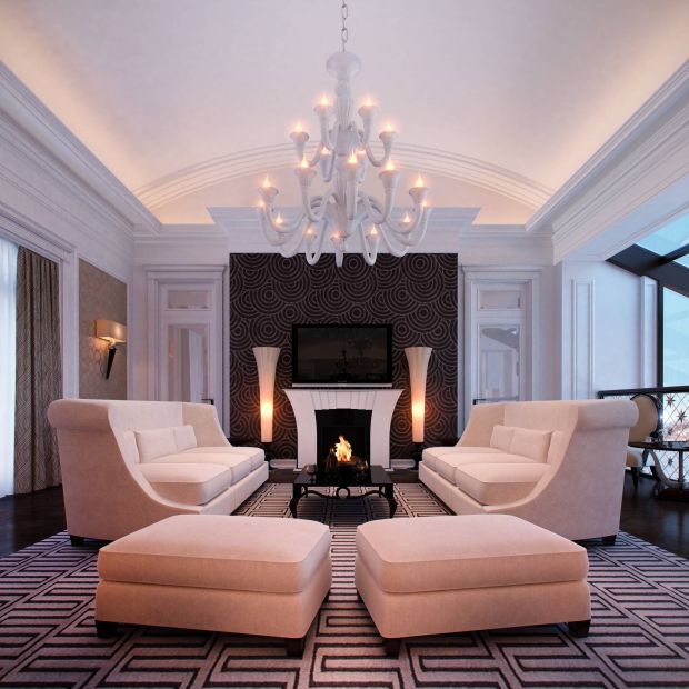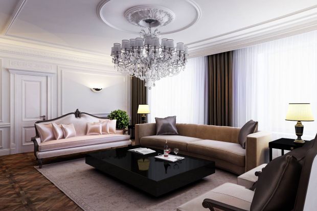 - Современная классика в дизайне интерьера гостиной – это всегда белые потолки. Из нескольких уровней, гипсокартонные с аккуратной лепниной или натяжные глянцевые. В обоих случаях усиливается эффект светлого объема. Главный светильник обычно – рожковая люстра, тоже со светлыми абажурами или хрустальными подвесками. Дополнительные источники: бра, торшеры, настольные лампы, встроенные светоточки.