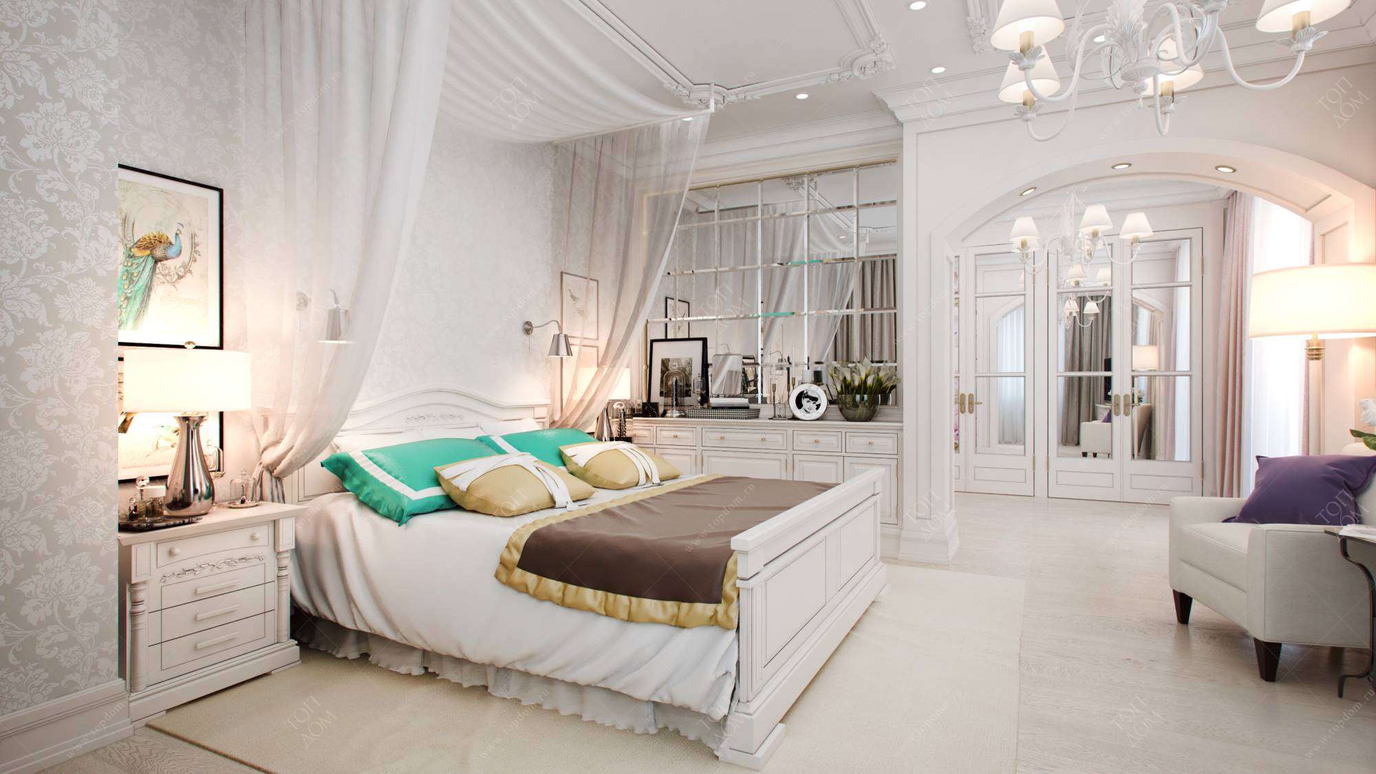 Пример роскошной отделки спальни в стиле современной классики – комната из галереи комфортных интерьеров частного дома. Массивная кровать из белого дерева обрамлена воздушным балдахином, стена над комодом облицована зеркальной плиткой, широкий арочный проем на границе с гардеробной зоной оснащен собственной подсветкой.