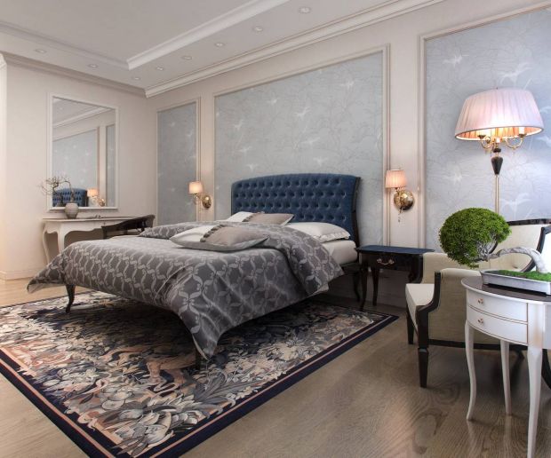 - Для отделки стен подходит окрашивание, оклеивание обоями. Сделать дизайн более выразительным получится, если оформить обоями только часть стен, например, за изголовьем кровати. Выкрашенные в тон стен молдинги создадут иллюзию облицовочных панелей. Потолочные плинтусы скроют места стыков. Для отделки пола можно выбрать доску, паркет, ковролин.