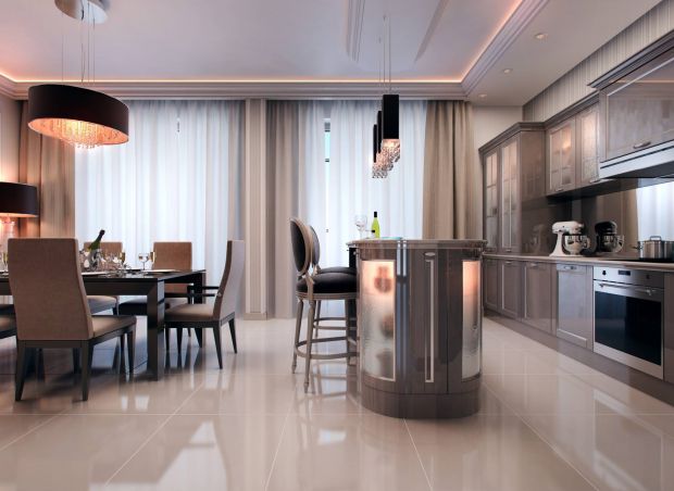 В лаконичных серых оттенках выдержан интерьер кухни в современном классическом стиле из проекта бежево-коричневой квартиры. Внимание привлекает обилие глянцевых поверхностей в отделке гарнитура и пола. Теплый желтый оттенок вводит подсветка полупрозрачных фасадов шкафов и острова на границе с обеденной зоной.