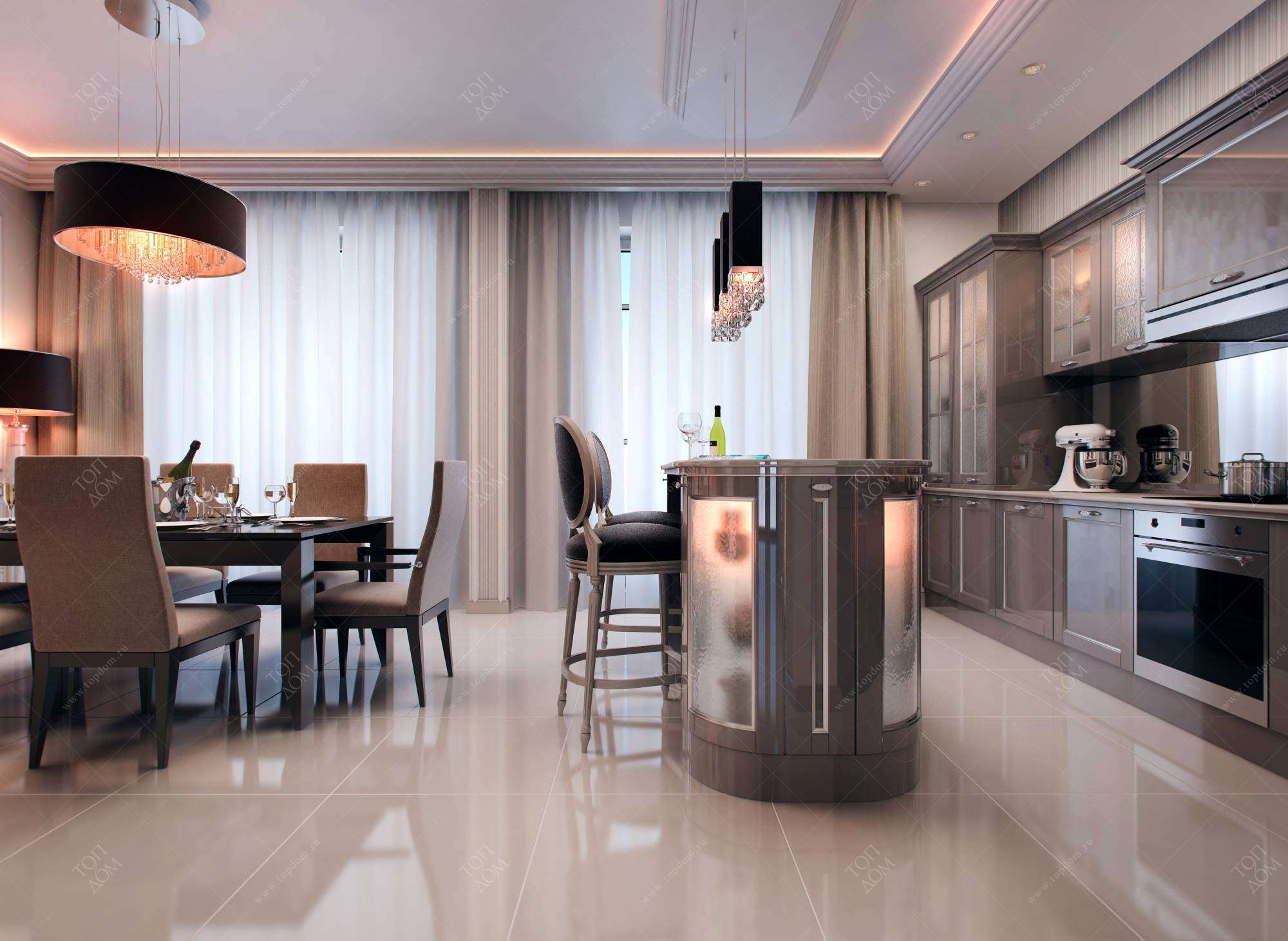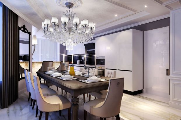 Пример того, как может выглядеть современная классика в интерьере кухни-гостиной, – проект 4-комнатной квартиры. Совмещенное пространство имеет нестандартную геометрию с множеством углов.