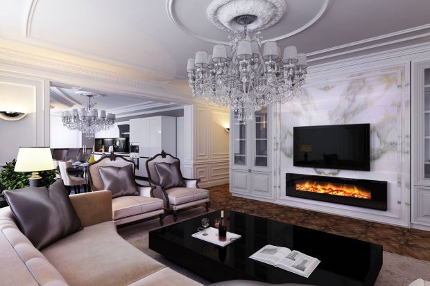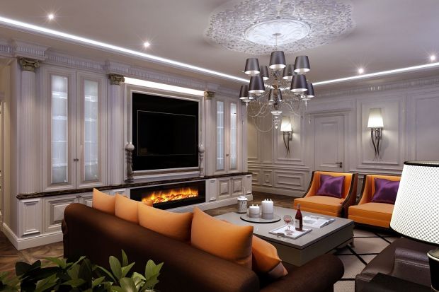 Пример современного классического интерьера гостиной можно увидеть в проекте дизайна 5-комнатной квартиры. Диванная группа здесь ориентирована на стену со встроенным камином и телевизором. В центре группы – приземистый черный глянцевый столик. Стены украшены молдингами, потолок – розеткой. Пышная хрустальная люстра выступает в паре со светильником из столовой.
