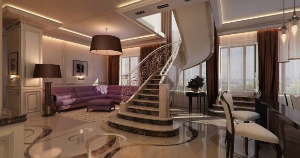 Архитектурные элементы – колонны, полуколонны, арки – выигрышно смотрятся в современном классическом дизайне интерьера квартир при наличии большой площади. В двухуровневой планировке центральное место – в функциональном и декоративном смысле – может занимать лестница, как в этом дизайн-проекте.