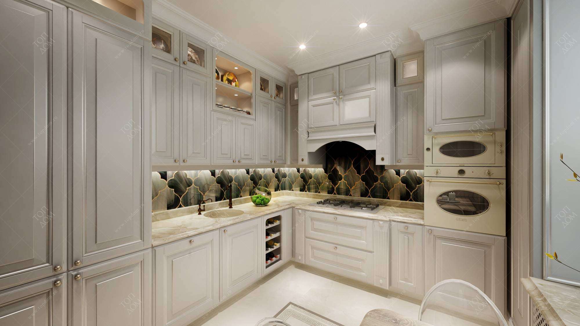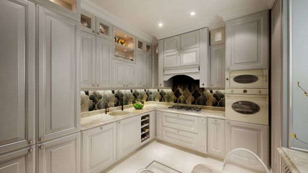 Красивый акцент в виде серой фигурной плитки с золотистыми вставками получил дизайн кухни в стиле современная классика из проекта квартиры в белых тонах. Темный фартук выгодно оттеняет светлые глухие фасады шкафов и ящиков.