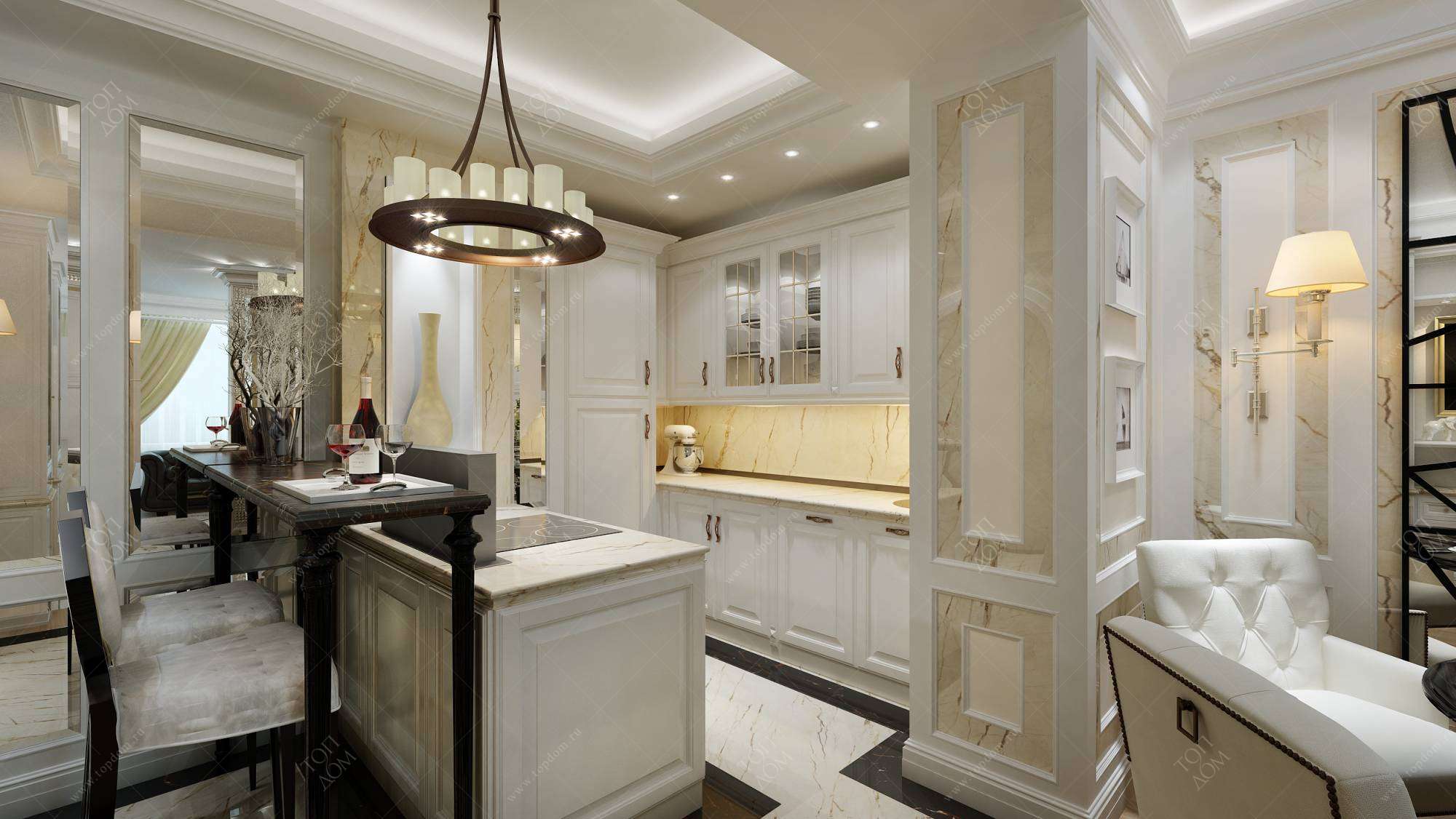 Интерьеры квартир в стиле современная классика гибко подстраиваются под имеющуюся планировку. В проекте трехкомнатных апартаментов в натуральных тонах стояла задача грамотно оформить совмещенную зону гостиной-столовой-кухни. В итоге выделены место отдыха с серым диваном, белая обеденная группа и такая же светлая кухня. Темно-коричневая перегородка с камином и вращающимся телевизором играет роль яркой контрастной детали. Элементы из мраморной плитки в сочетании с белой настенной лепниной смотрятся сдержанно и нарядно. Свой вклад в парадную обстановку вносят зеркала за барной стойкой.