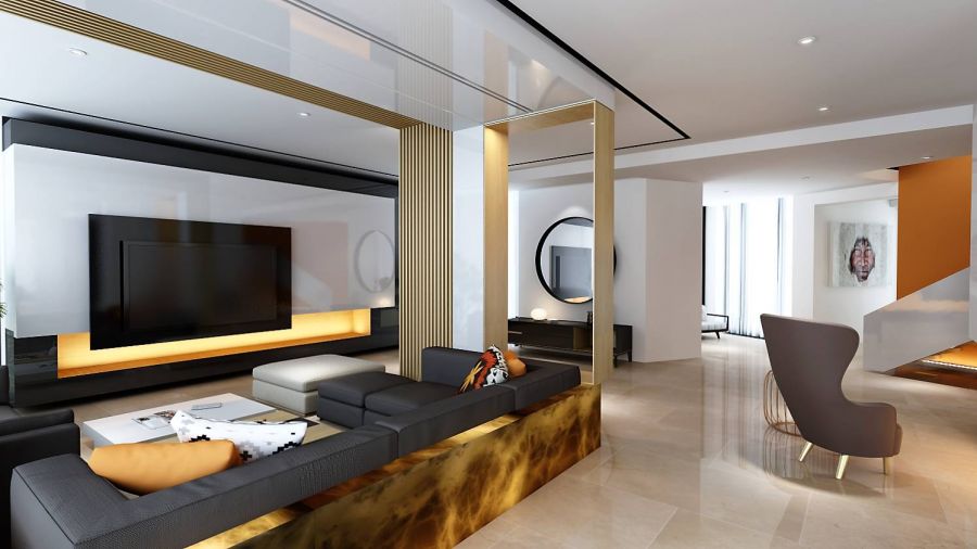 В проекте интерьера таунхауса в ЖК Западная долина гостиная решена в палитре светлого мрамора, холодный блеск глянцевых поверхностей уравновешен скругленными очертаниями дивана с креслами и зелеными растениями.