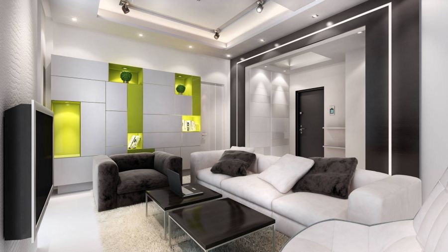 Гостиная в стильном белом интерьере квартиры с яркими акцентами получила приятный контраст с графитовым цветом и выразительные желто-зеленые вставки с подсветкой.