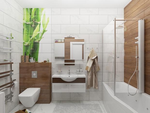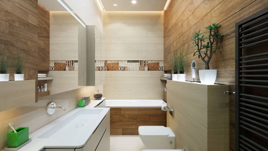 | Материалы | Облицовочные материалы должны отвечать практическим соображениям. Популярная отделка – керамическая плитка под дерево, бетон, металл, мрамор. Разницей фактур и цветов можно добиться акцента на нужные зоны. Потолки оформляют подвесными конструкциями с ровной гладкой текстурой, внутрь встраиваются светоточки. |