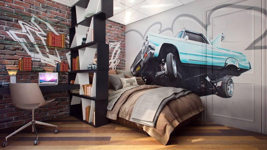 Первая рассчитана на мальчика-подростка, здесь использована тема лофта, яркий принт на стене разбавляет коричнево-бежевую палитру.