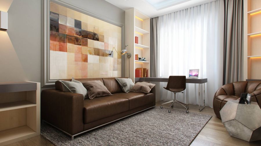 Вторая – тоже для юноши, выполнена в серо-коричневой гамме с теплыми песочными оттенками настенного панно и желтой подсветкой стеллажей.
