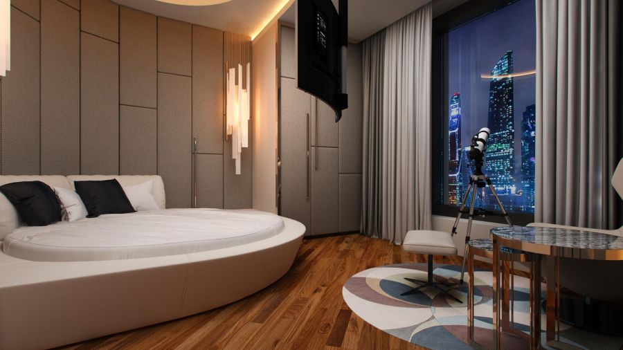 | Освещение | В потолок равномерно встроены точечные светильники, основное внимание – на дизайн локального освещения: подвесные лампы над прикроватными тумбами, настольные лампы. |