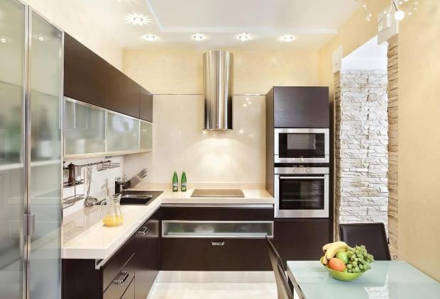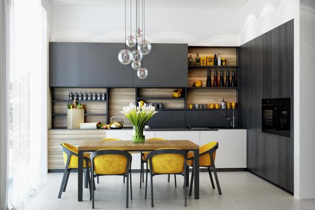 | Цвет | Для кухонной зоны в актуальном дизайне уместна как светлая гамма (белый, бежевый, серый, голубой и т.п.), так и темные тона (коричневый, графитовый). Часто главным приемом является контраст двух основных цветов с подключением яркого акцента в виде стульев, отделки стены, броского фартука, посуды, текстильных элементов. |