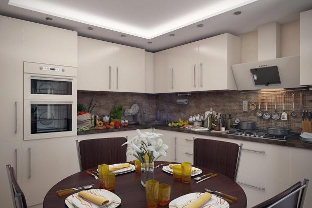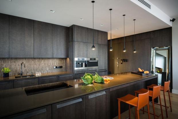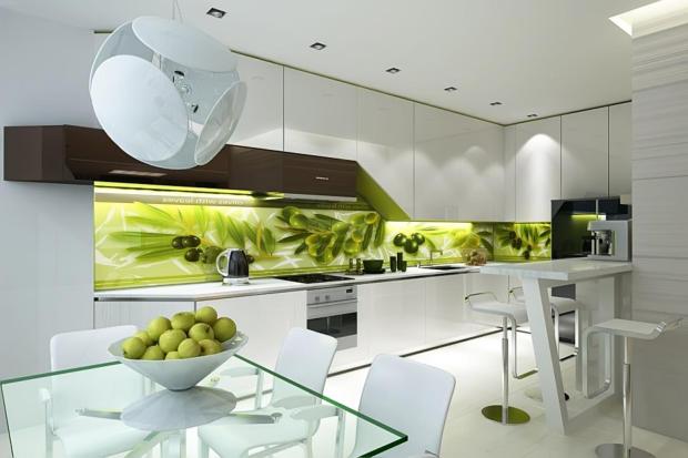 | Освещение | В просторной кухне организуют освещение нескольких видов: встроенные по периметру потолочные светильники (в рабочей зоне – обязательны) отвечают за общий свет, большая подвесная люстра располагается над обеденным столом, барная стойка выделена собственным светом (как правило, тремя-четырьмя подвесными лампами). Дизайн светильников – всегда оригинальный, нестандартный. |