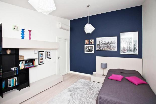Подходящие отделочные материалы: декоративная штукатурка, краска, жидкие или виниловые обои. Если сделать одну стену более яркой, выделить гипсовым барельефом, 3D-обоями, то комната не будет выглядеть скучной и однообразной.