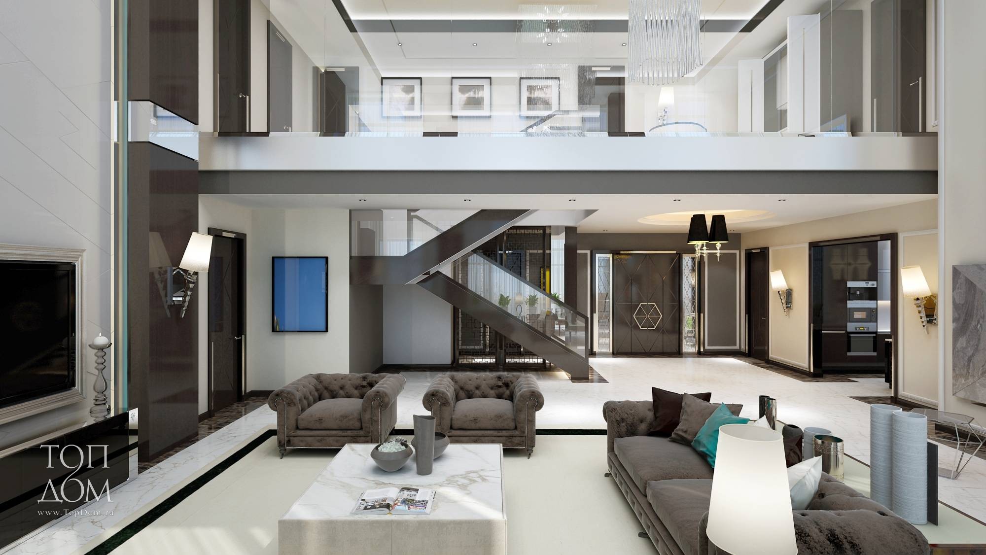 Красивые интерьеры частного дома в поселке «Миллениум Парк» строятся на комбинации открытого пространства и приемов из традиционного и современного стилей.