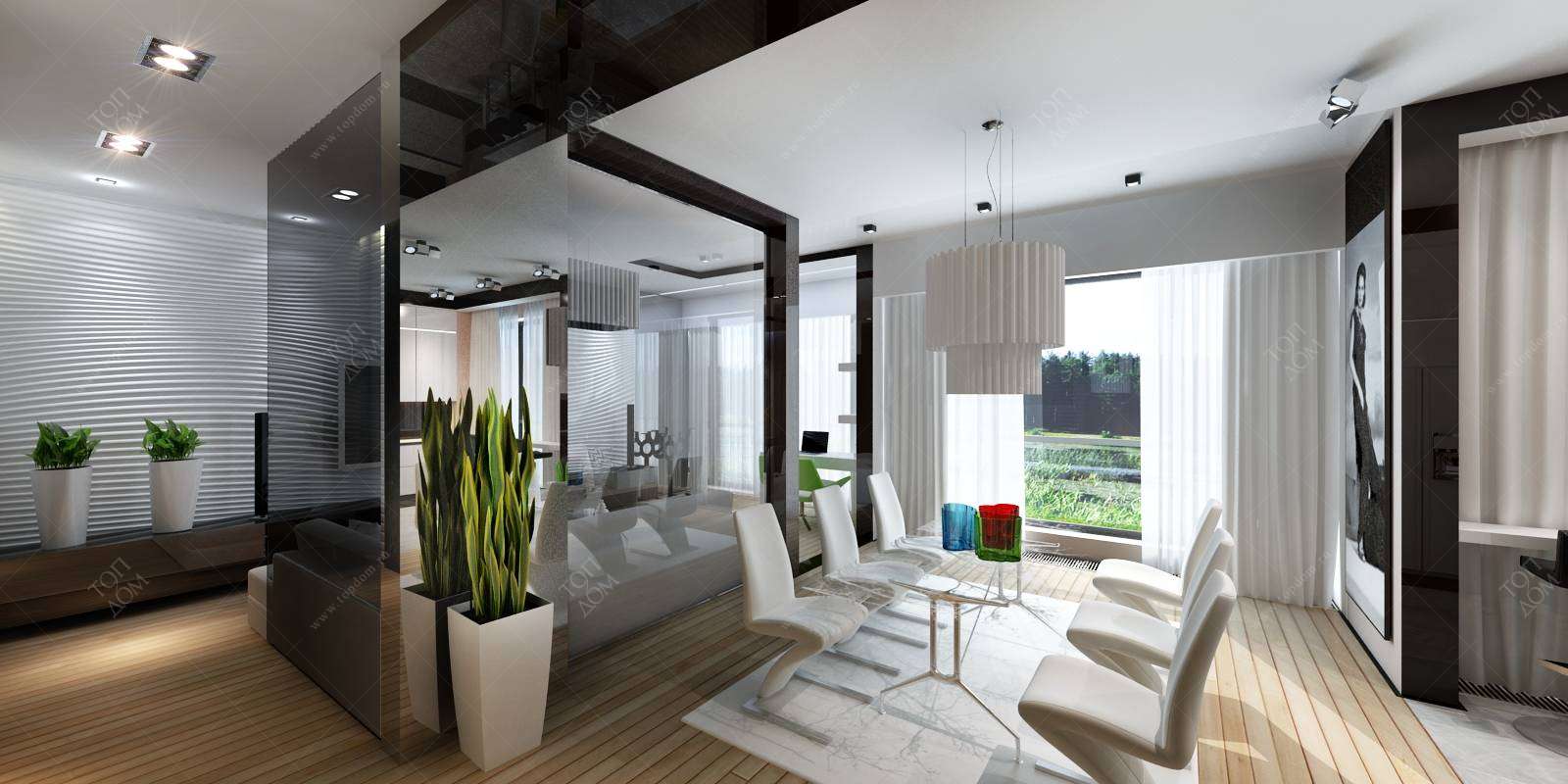 3. Планировка стремится к созданию открытого пространства, без сложных конструктивных элементов, часто с панорамным остеклением. Распространенное решение – интерьер студийного типа.