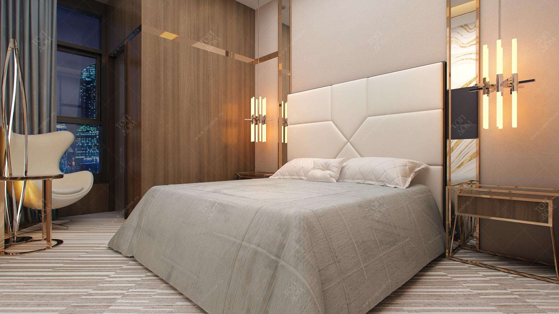 | Освещение | В потолок равномерно встроены точечные светильники, основное внимание – на дизайн локального освещения: подвесные лампы над прикроватными тумбами, настольные лампы. |