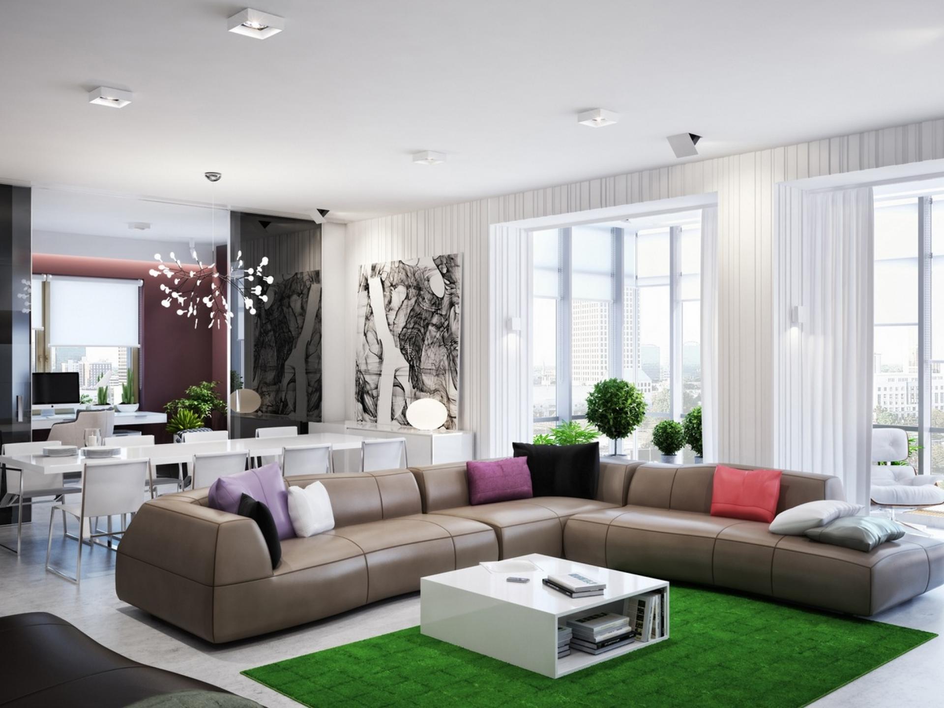| Цвет | Дизайн интерьера гостиной в современном стиле подразумевает однотонную палитру (бежевую, белую, серую, коричневую), которая создает впечатление уютной, сдержанной обстановки. Уместен контраст светлого фона и темных плоскостей. Включение ярких красок (оранжевых, бирюзовых, синих, желтых) возможно в деталях. |