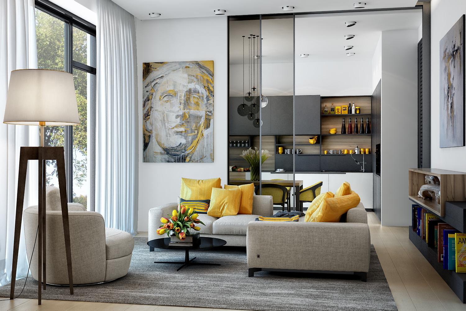 Элегантные интерьеры гостиной комнаты в современном стиле представляет проект дома в Крыму. Контраст светлой обстановке задают черные обрамления оконных и арочных проемов. Зона камина выделена светло-желтым ониксом, чуть дальше в зоне кухни новый цветовой акцент – стулья с горчичной обивкой.