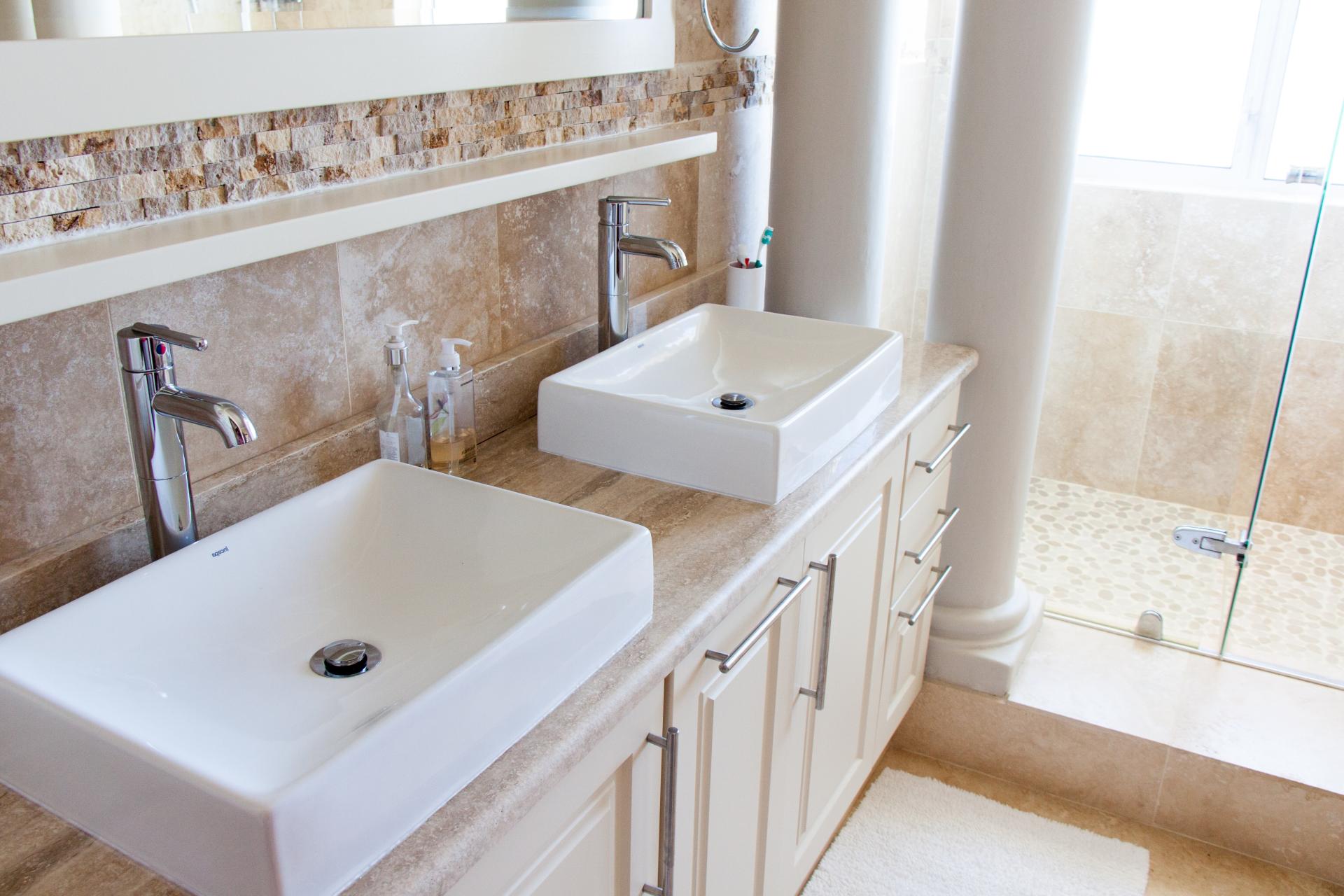 Используются: подвесные шкафы и тумбы, раковины в виде круглых, овальных, прямоугольных чаш, однорычажные смесители, встроенные и подвесные модели унитазов. В большой по площади комнате размещают одновременно и купель, и душевой угол. |