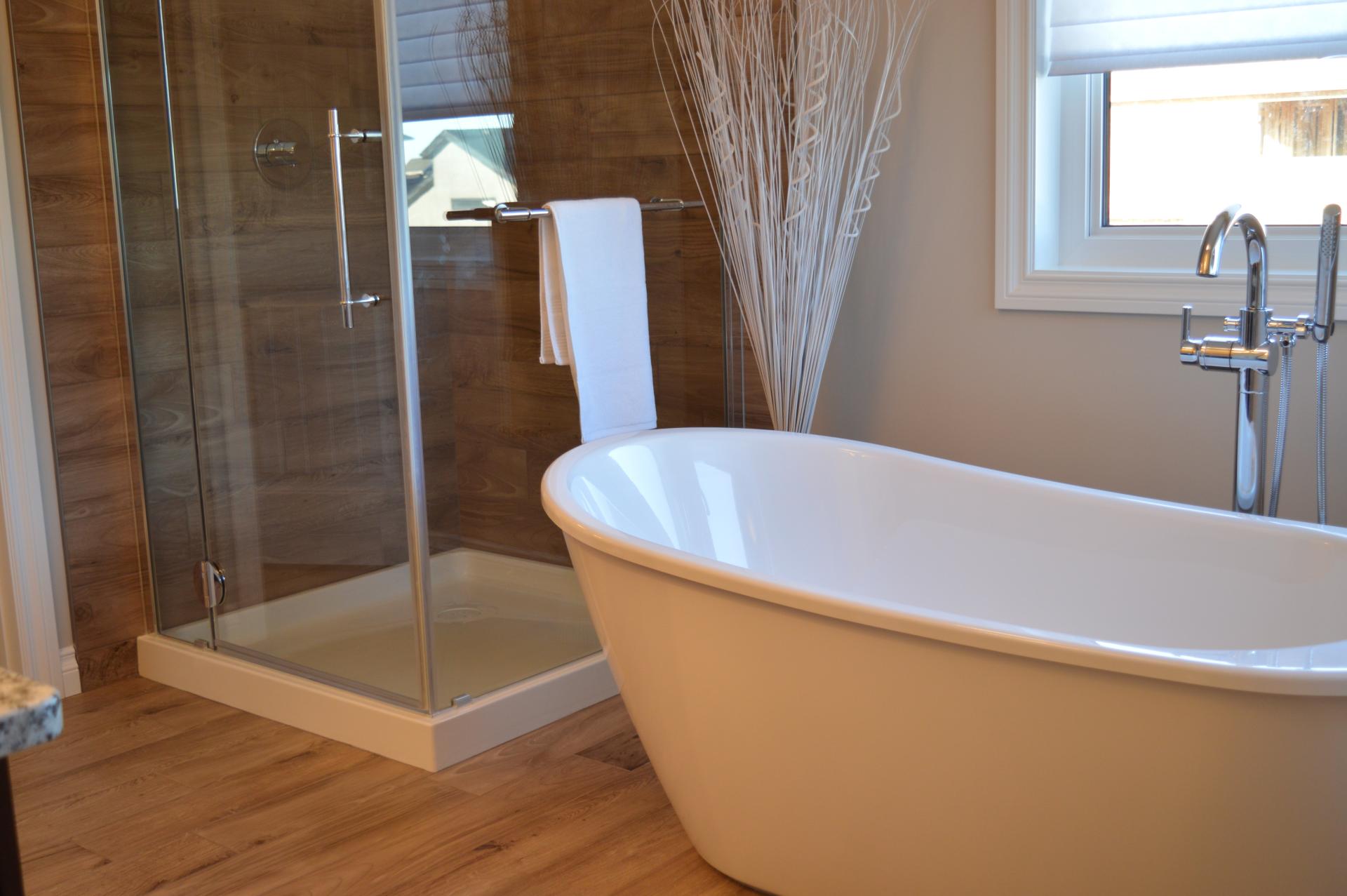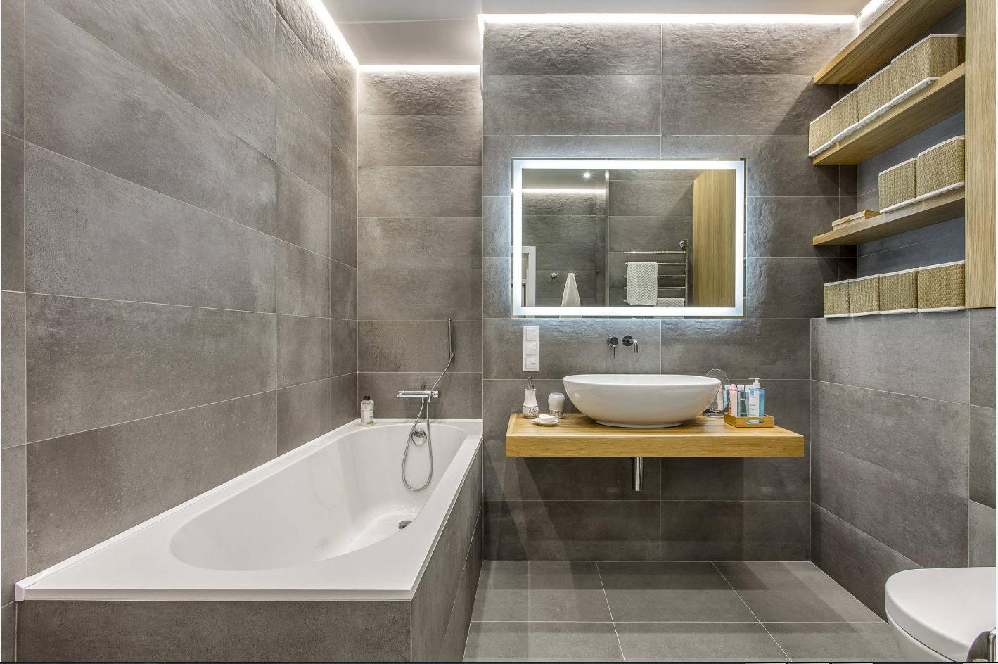 Красивые интерьеры ванн, оформленные в современном стиле и других направлениях, представлены в нашей галерее. К примеру, дизайн комнаты в частном доме на морском побережье. Помещение имеет панорамное остекление, внутри зеркальные панели комбинируются со светло-серой плиткой и деревом.