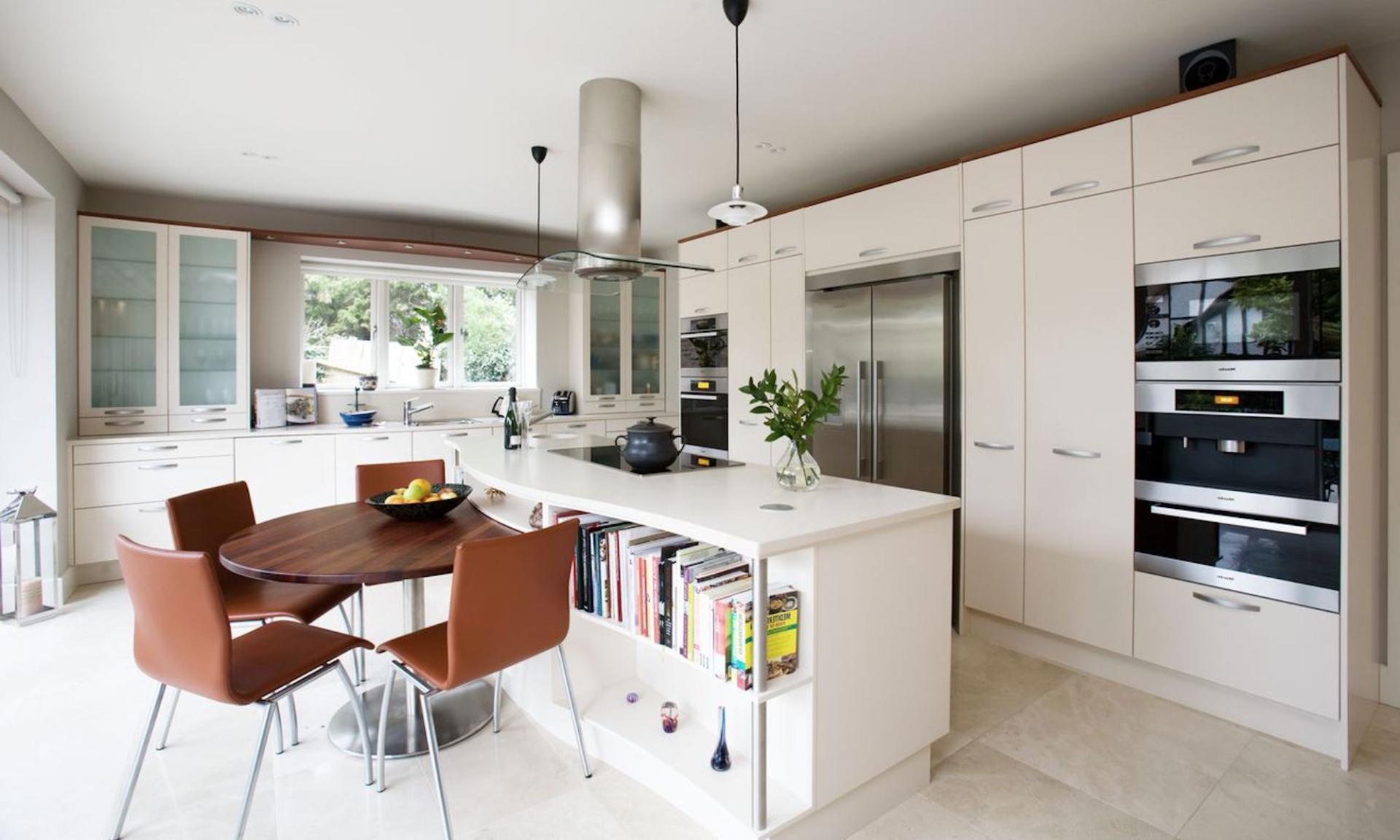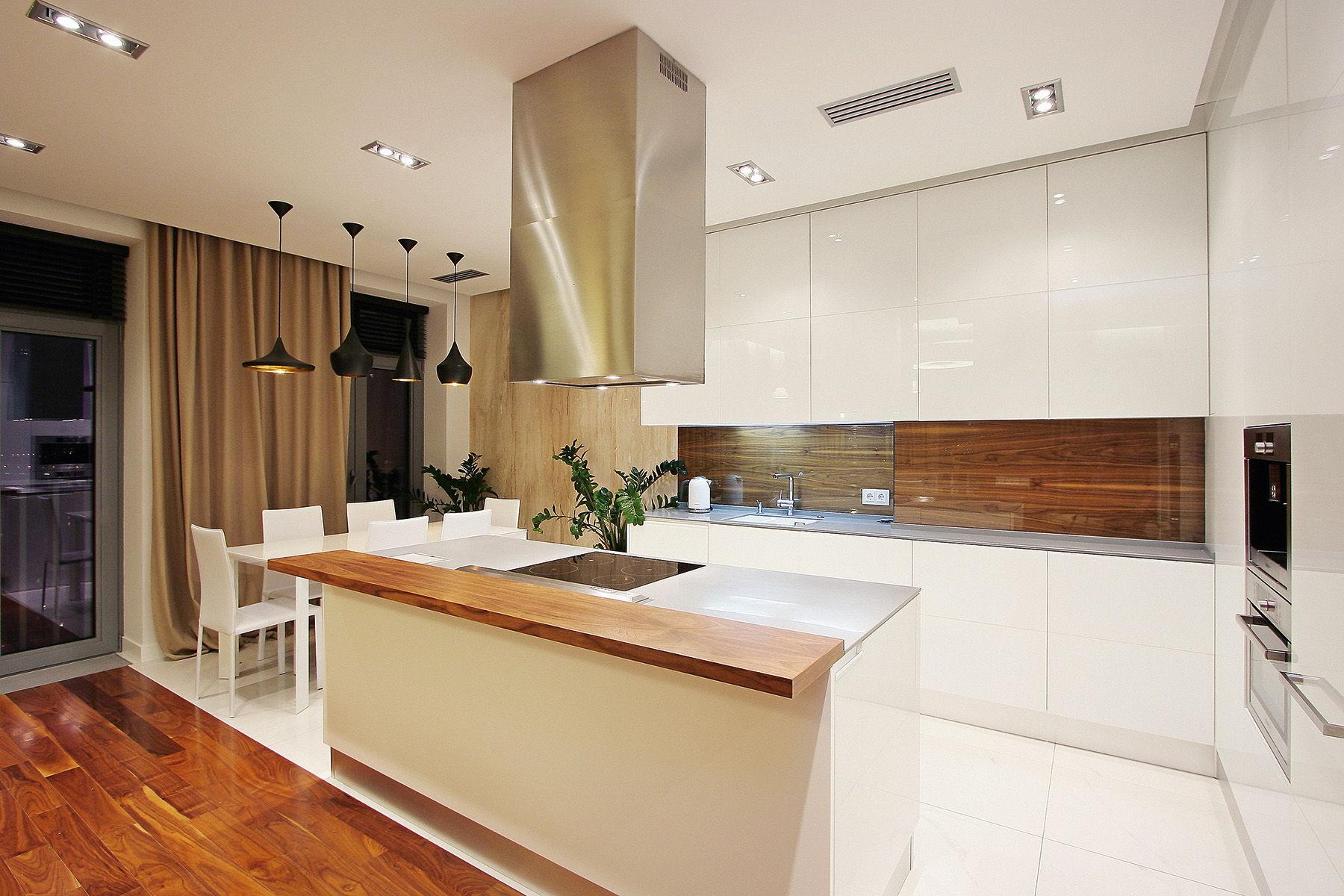 | Освещение | В просторной кухне организуют освещение нескольких видов: встроенные по периметру потолочные светильники (в рабочей зоне – обязательны) отвечают за общий свет, большая подвесная люстра располагается над обеденным столом, барная стойка выделена собственным светом (как правило, тремя-четырьмя подвесными лампами). Дизайн светильников – всегда оригинальный, нестандартный. |